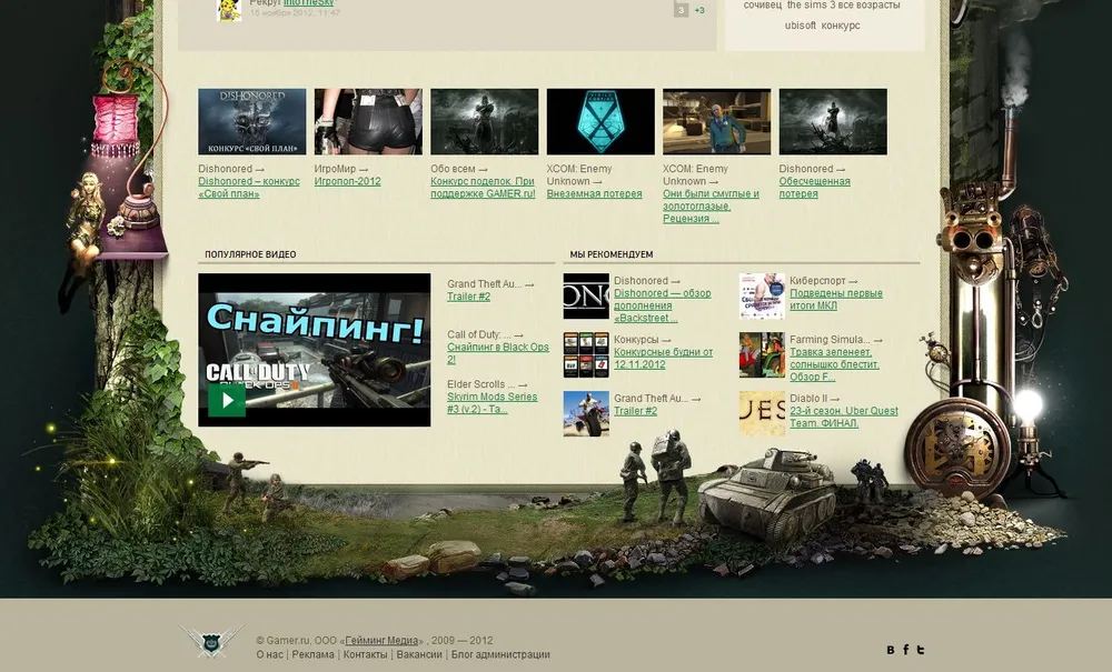 Сайт теперь у меня, например, выглядит вот так: горящий топор, воткнутый в пожелтевшие страницы книги, и модерновые виджеты. Вернуть "старину" на 100%, как я уже говорил, технически невозможно, однако ламповость и теплота отлично, как выяснилось, сочетаются с новой разметкой. Лампочка в связи с новой организацией меню теперь не показывает, в каком разделе вы находитесь, но осталась в шапке и символизирует.