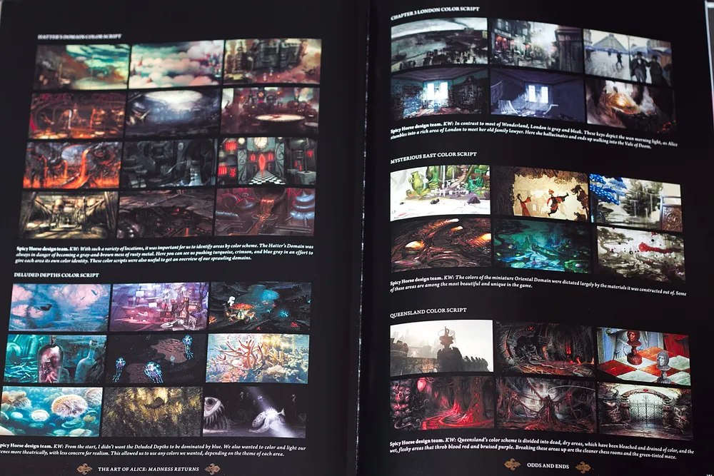 Содержание артбука наверняка не разочарует ни одного фаната Алисы: кроме, собственно, арта внутри нас ждет множество набросков, концептов и финальных дизайнов для большинства персонажей, локаций и внутриигровых предметов. И все это с подробными пояснениями и комментариями от дизайнеров и художников. Приложенные картинки не оставляют никаких сомнений, что дизайн игры остался все таким же великолепным и таким же сумасшедшим. И весьма символичным. Даже не знаю что еще сказать. Смотрите картинки и убеждайтесь в вышенаписанном сами. :)