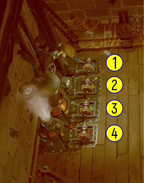 Кратчайший путь к двери, за которой находится лестница, ведущая на пятый этаж, пролегает через столовую. В восточном зале столовой у южной стены есть четыре разноцветных рычага. Их нужно повернуть в следующей последовательности: зеленый (3) – синий (1) – желтый (2) – красный (4) – зеленый (3). Рядом с рычагами появится сундук, в котором вы найдете деньги и различные зелья.