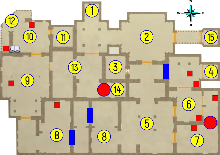 1 – лестница (подъем на второй этаж). 2 – подъемник. 3 – фармаколог Тобиас Пирин. 4 – южный коридор. 5 – ритуальный зал. 6 – сад. 7 – часовня. 8 – уборная.