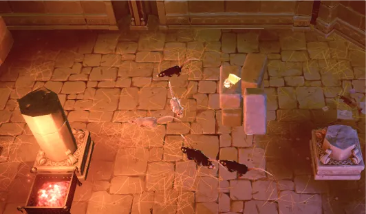 Далее отправляйтесь в уборную и осмотрите западную стену. Вы обнаружите в ней дыру. Она настолько маленькая, что пролезть в нее смогут лишь самые низкорослые члены отряда: гном и эльфийка. Протиснувшись сквозь дыру, они обнаружат за ней коридор, ведущий на север, где находится обширный зал. В этом зале гном и эльфийка увидят хомяка Му, забравшегося на возвышение, чтобы спастись от крыс, напавших на него. Крыс придется истребить, после чего вы сможете забрать хомячка.