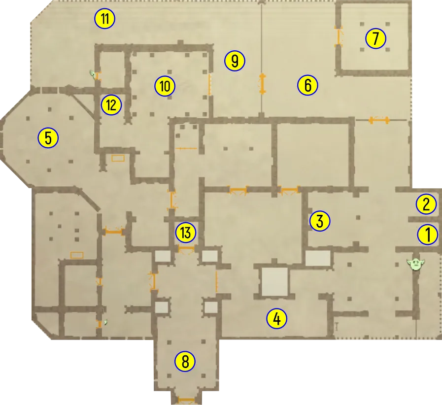 1 – лестница (подъем на второй этаж). 2 – подъемник. 3 – фармаколог Тобиас Пирин. 4 – южный коридор. 5 – ритуальный зал. 6 – сад. 7 – часовня. 8 – вестибюль. 9 – садовник Акакий. 10 – склеп. 11 – рычаг. 12 – лестница (спуск в подвал). 13 – лестница (подъем на третий этаж).