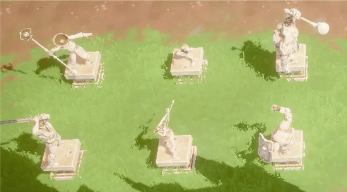 В саду вы увидите группу статуй. Обратите внимание на то, что внешние статуи смотрят внутрь композиции, а внутренние статуи смотрят друг на друга. Это нам пригодится позднее в комнате с головами.