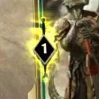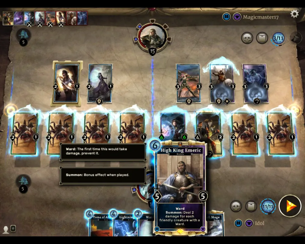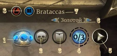 6 – «титул» игрока. В игре можно получить достижения, за которые даются титулы. В данном случае титул «Золотой» игроку дан за достижение «Нанесите 8 единиц урона при активации «Золотого меча». Титулы ничего не дают, кроме как потешить свое тщеславие. Хотя опытный игрок может по титулу предположить, с каким именно типом колоды ему придется встретиться. Например «Тактик» обозначает, что в колоде могут быть карты, передвигающие существ с линии на линию, «Верховный атромант» - что в колоде много карт, призывающих атронахов, и т.д. Опять же, другие игроки, зная это, берут какие попало титулы, или тот, что им больше нравится, поэтому доверять титулам не стоит.