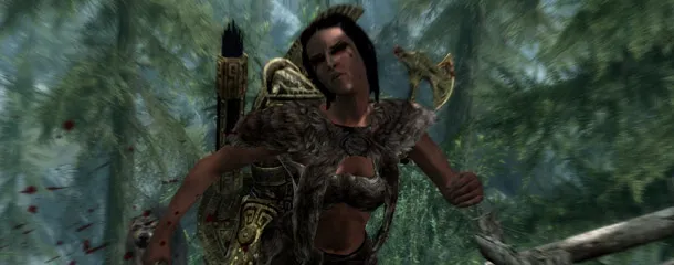 Первым человеком, убитым мной на обратном пути в Рифтен, становится какая-то бандитка. Мы с Джаспером решили обойти величайшую вершину Скайрима с юга. Вчера ночью мы без всяких происшествий прибыли в Ривервуд, провели там ночь, не обращая внимания на местных жителей и их проблемы, а утром отправились дальше. Для нас это незнакомая местность, так что, заметив на своём компасе шахту, я отправляюсь к ней, и по дороге на меня нападает эта женщина с булавой.