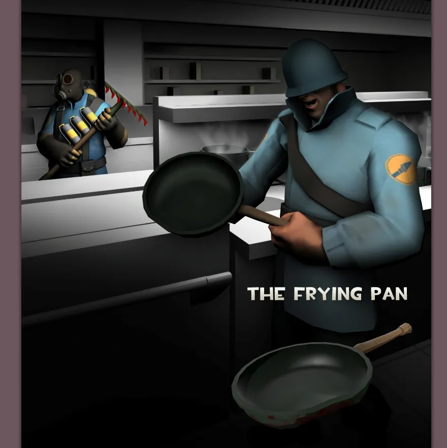 Это всеобще известно, что сковородки- это кухонные приспособления для приготовления пищи. Наш солдат- плохой повар, поэтому он предпочитает использовать сковородку в своей манере: проламывать человеческие черепа, хотя вы должны были обо всем догадаться по большой вмятине. И это не кетчуп!