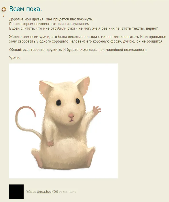 Этот блок создаётся одним из последних и не связан со всеми остальными. А связан он с уже печально известными событиями, в которых Pegazs замолчанил, а потом и заткнул DraKo. Пегас долго посыпал голову пеплом, ибо первая затычка и первая молчанка - это тяжело, а тем более когда они вместе, а тем более за новогоднее поздравление... Но посмотрите на цитату чуть выше. А потом вспомните правила.