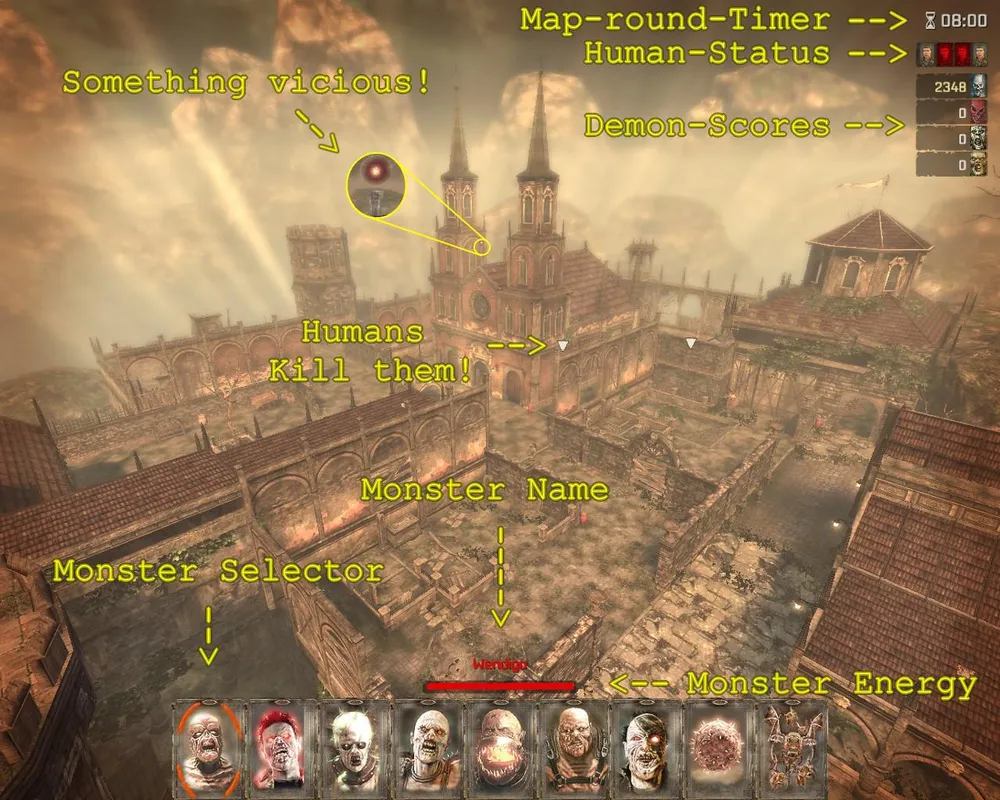 Битва-здесь играют 4 человека и 4 демона.Человекам нужно выжить определённое количество времени и раундов,демонам нужно убить всех человеков.