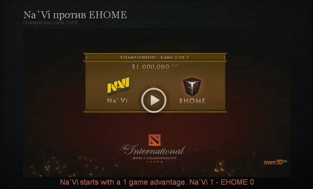Свершилось то, чего мы так долго ждали: вот вот в последней схватке за 1000000$ сойдутся финалисты из группы проигравших и группы победителей: Китайцы EHOME против украинцев NA'VI.Всего будет 5 игр, но 1 игра засчитанна автоматической победой NA'VI, так как они являются чемпионами в группе победителей.Для победы им нужно всего 2 игры,тогда как EHOME нужно выиграть все 3.Чтож, пожелаем соперникам удачи.