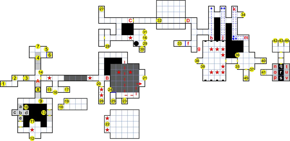 21. Рычаг. Поворот этого рычага открывает дверь на юге зала. Пол этого зала представляет собой ямы, которые периодически закрываются и открываются. Проще всего добраться до рычага, который отображен на карте красной пунктирной линией. Если вы провалитесь в яму, то окажетесь в зале с порталом (22), который охраняют две летучие мыши.
