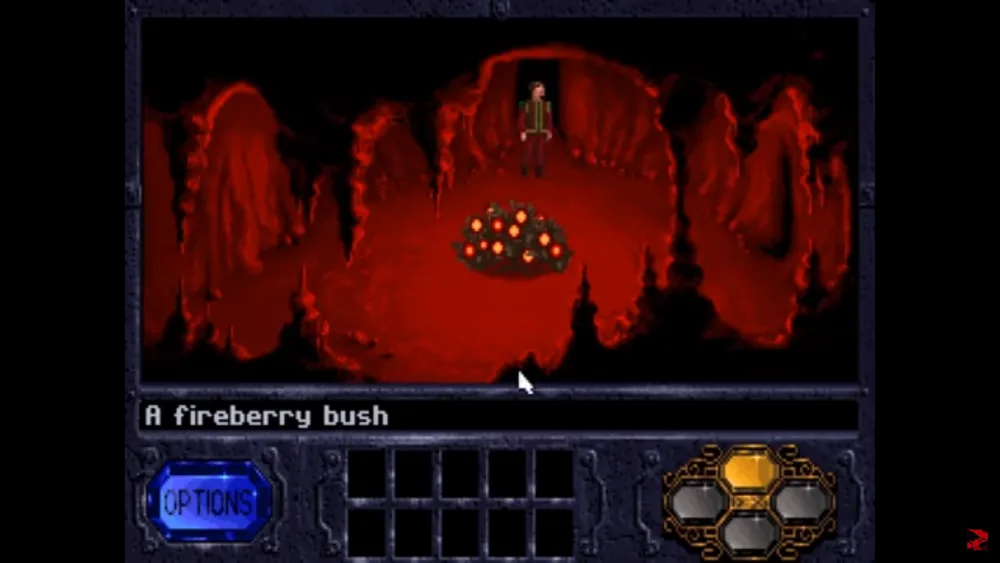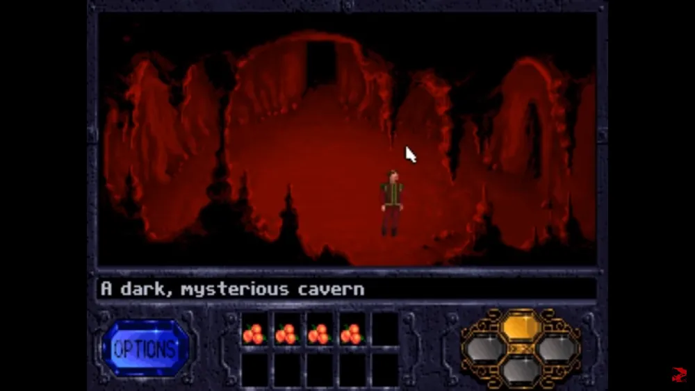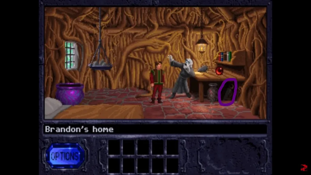 Многие геймеры, которые познакомились с первой частью Кирандии через не лицензионные носители, столкнулись с багом отсутствующей пилы. По случайности, или ввиду защиты от взлома, в первую часть добавили такую «багофичу»: в самом начале игры в домике своего деда, главный герой Брэндон не находил пилы под столом. Я пометил ее на скрине. Без этой жизненно важной пилы, пройти стартовую локацию просто невозможно. Все, конец игры!