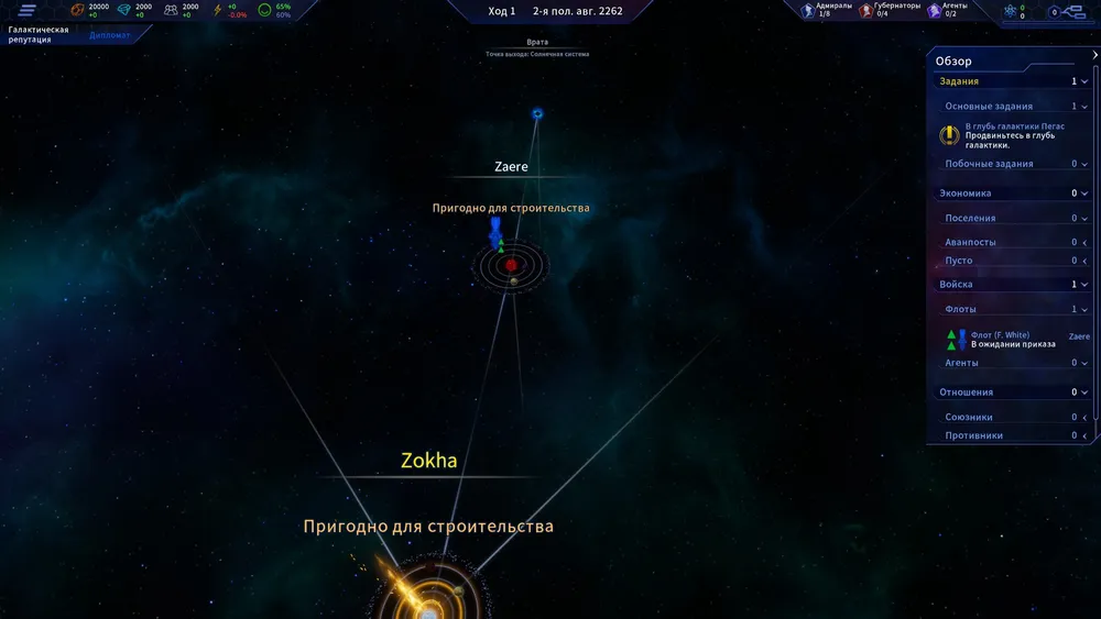 Сюжетная кампания позволяет постепенно знакомить игрока с правилами The Pegasus Expedition. Так, после начала партии и прибытия в галактику Пегас, мы будем осваивать управление флотами и ведение космических сражений. Флотилия имеет два очка хода, что позволяет атаковать вражеский флот в пределах двух "шагов". Путь измеряется при помощи звёзд, корабли летают от звезды к звезде. Поэтому иногда встречаются важные звёзды, без захвата которых не получится добраться кратчайшим путём до вражеской территории (либо делать для этого неоправданно большой крюк).