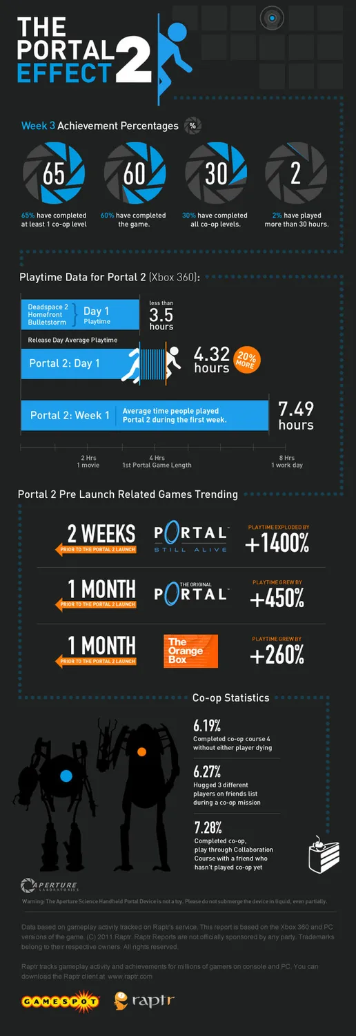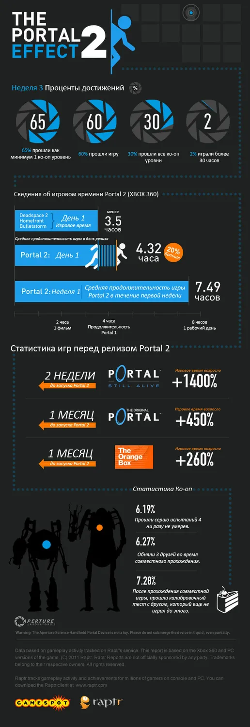 Raptr поделился с Gamespot статистикой Portal 2 PC и Xbox 360 версий за 3 недели. К сожалению, из-за проблем с PlayStation Network, PS3 к статистике причастия не имеет. Числа оказались очень интересными. Картинку перевел на русский язык.
