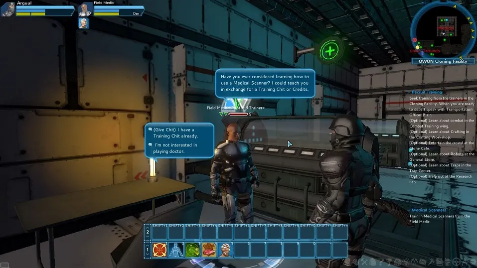 Далее подходим к инструктору, который стоит слева от входа в медцентр. Инструктор предлагает научить нас пользоваться медицинским сканером (Medical Scanner). Что ж, согласны (Give Chit):