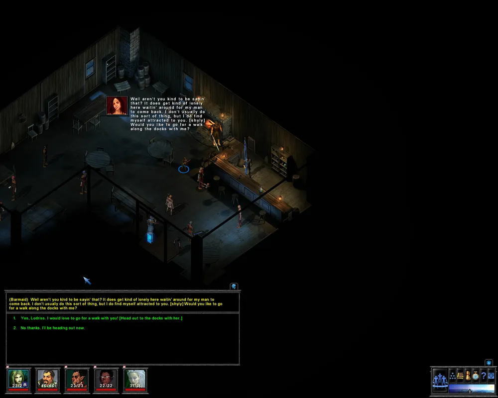 По поводу возможности наносить нелетальный урон. Вообще, если вы деретесь голыми руками, то урон наносится стамине противника (она не отображается, но равна текущему уровню HP). После необходимой кондиции тумаков, «клиент» падает и позволяет нанести по себе милосердный удар «coup de grace», который прервет его жалкую жизнь. Отмечу, что монашеские кулаки наносят урон именно по стамине (прямо как в Morrowind). Теперь представим сценарий: мой варвар с двуручным топором, вместо тяжелых и размашистых ударов, начнет вдруг аккуратно постукивать гоблина обухом по голове, со штрафом в минус четыре (который всегда накладывается при данном виде атаки). Допустим, гоблин упадет. После этого я произвожу удар милосердия, с критическим уроном. Если HP у врага остается, то он делает спасбросок стойкости против мгновенной смерти. Будь это простой гоблин, то он, скорее всего, сразу умрет, но противник посильнее, например гоблин-лорд, выживет и встанет. После этого процесс необходимо будет повторить. А пока варвар занят танцами с одним противником, ваш тыл с магами, бардами и плутами превратят в фарш. Вопрос: зачем бы мне наносить нелетальный урон со штрафом, когда я просто могу покончить с противником за несколько ударов, без понтов и «coup de grace»? Я понимаю, если бы мне попалось задание, где нужно прорваться в стан врага и похитить живого «языка» - тогда да, нелетальные удары пришлись бы кстати. Но ведь таких заданий в игре нет! Лишь один раз пришлось драться в таверне на кулаках с местным «паханом», чтобы освободить из рабства пирата-гомосексуалиста.