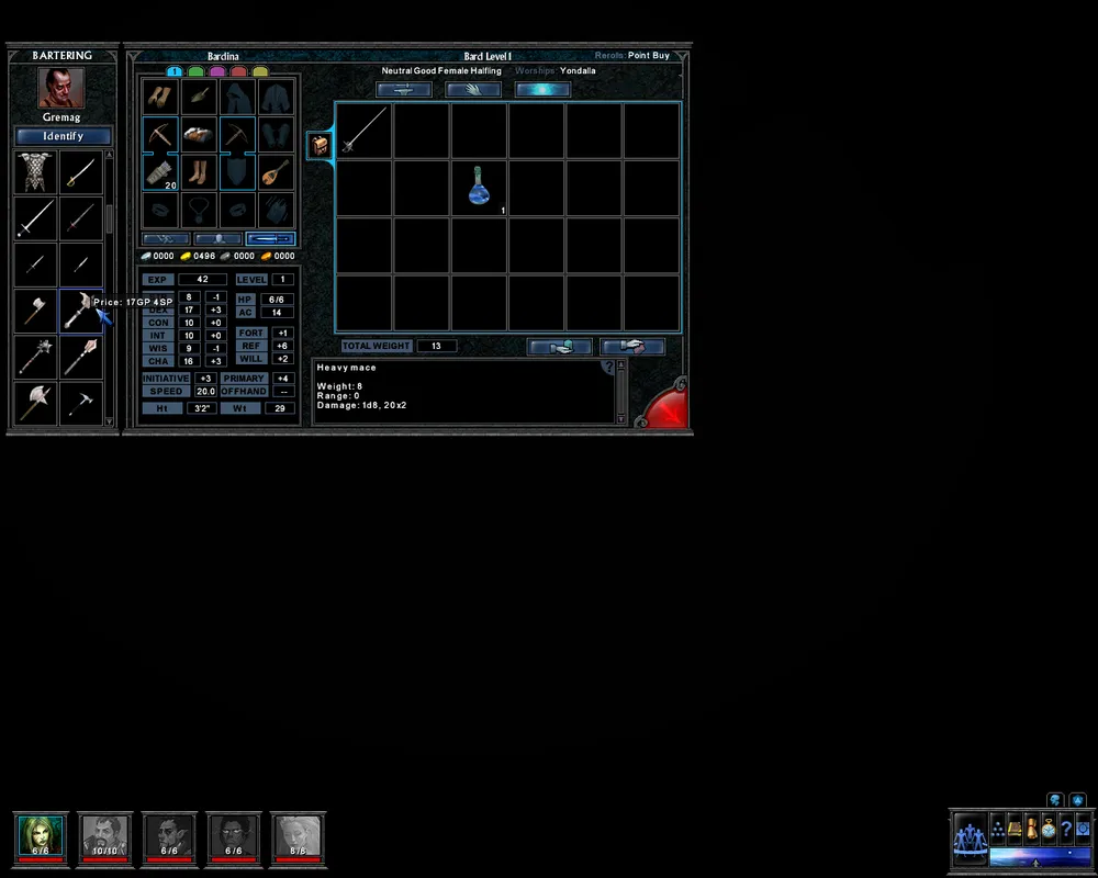 Заканчивая разговор о skills, отметим, что магические вещи с помощью «Lore» определять больше нельзя, так как данный навык исключен. Что правильно, на мой взгляд, так как в NWN не было необходимости изучать заклинания идентификации или тратить деньги – даже воин, выпив зелье знаний, мог определить артефакты; а чаще всего просто платили деньги за определение, так как 100 золотых вообще не деньги для солидного искателя приключений. В ToEE же 100 золотых (какая синхронная экономика в двух разных мирах) это серьезные деньги, которых и так будет вам не хватать. Если вы, выбравшись из очередного этажа Храма Стихийного Зла, идете определять все ваши свитки, зелья и волшебные предметы, то будьте готовы расстаться с солидным процентом своих денег. Здесь-то и придет на выручку «никчемный» бард с заветным заклинанием идентификации (не тратить же на это ценную магию волшебника).
