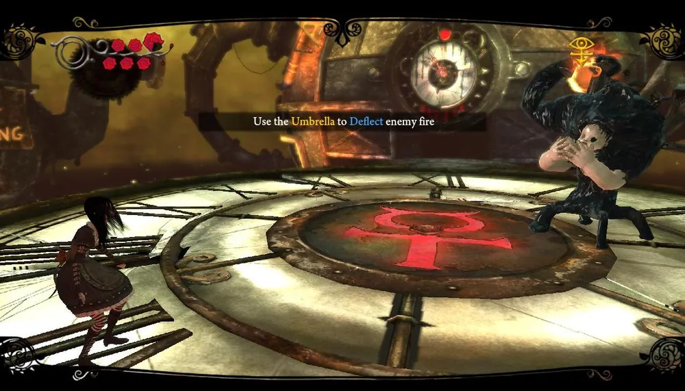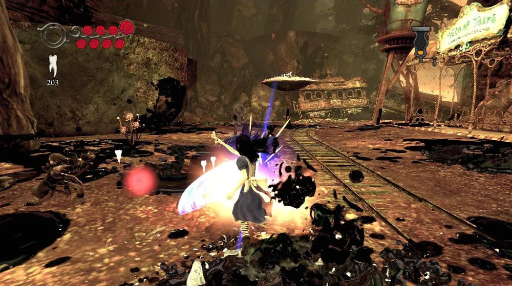 Сила воли как таковая в Алисе не изменилась, и об этом я писал чуть выше. Другое дело, что эта самая «сила воли» как один из параметров боевой системы исчезла насовсем: в «Madness Returns» балом правит простая концепция закликивания врагов мышкой (ну или геймпадом). Параллель с God of War проведется уже в первые минуты прохождения, когда в тонкие, но ловкие руки Алисы попадет стрижающий нож (Vorpal sword). Никаких серьезных комбо-атак, мы только и делаем, что жмем на кнопку удара, иногда выполняя маневры в стороны и прыжки ввысь. Со временем арсенал юной мечтательницы пополнится перцеметом, часовой бомбой в виде кукольного кролика, палкой с головой пони на конце, боевым чайником и зонтом, собравшим в себе полезные защитные функции. И это все. Скромный набор средств уничтожения кое-как искупает система прокачки, но и тут не стоит ждать откровений. Зонтик же, к слову, напрочь отказывается помогать Алисе в РС-версии «Madness Returns».