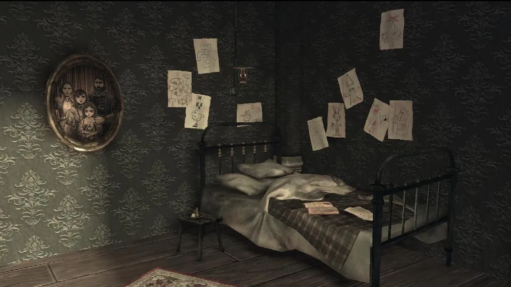 Интересной геймплейной находкой можно назвать функцию уменьшения Алисы. На локациях то и дело встречаются места, попасть в которые можно только будучи ростом в дюймов двадцать. Зачастую в таких маленьких комнатках мы будем находить важные воспоминания, в той или иной степени проливающие свет на происходящее. Рост героини будет играть важную роль не только в поисках секретных помещений, но и при решении головоломок. Здесь разработчикам удалось передать одну интересную мысль: порой ребенок видит больше всякого взрослого. И действительно: фантазия крохотной Алиски намного богаче, и в той ситуации, где взрослый давно бы опустил руки, воображение ребенка рисует свой выход из положения. С виду пустой коридор при уменьшении наполняется едва видимыми лесенками, но стоит нам вернуться в прежний размер, как жизненно важные платформы теряют свои очертания и вскоре вовсе пропадают. Будучи маленькой, Алиса может замечать и подсказки, которые авторы щедро оставили на полу, стенках и потолках локаций.