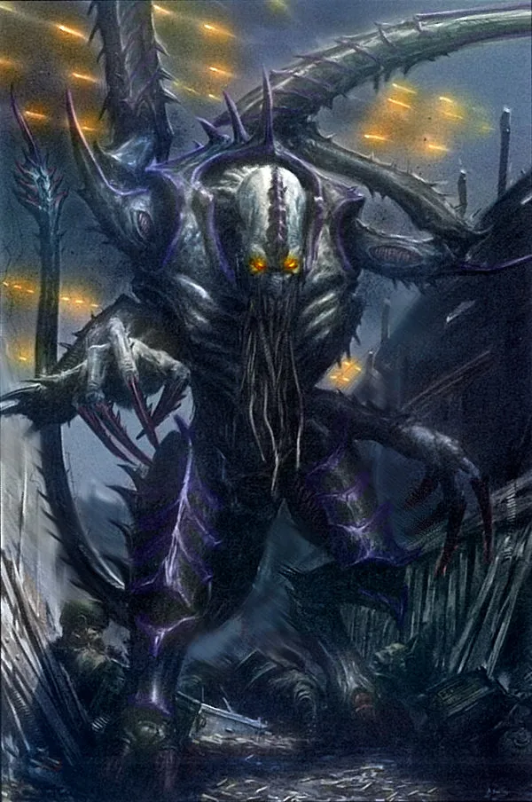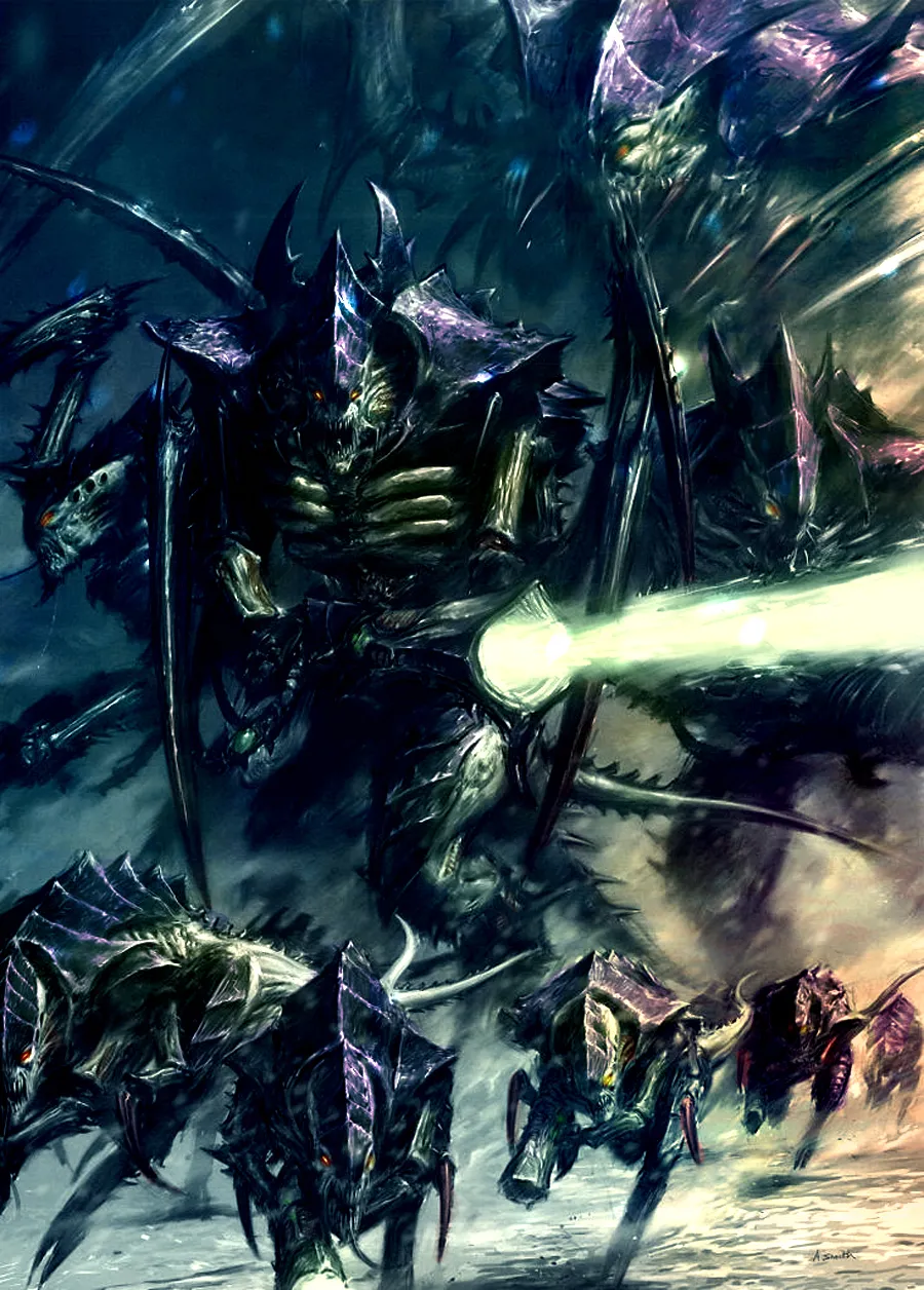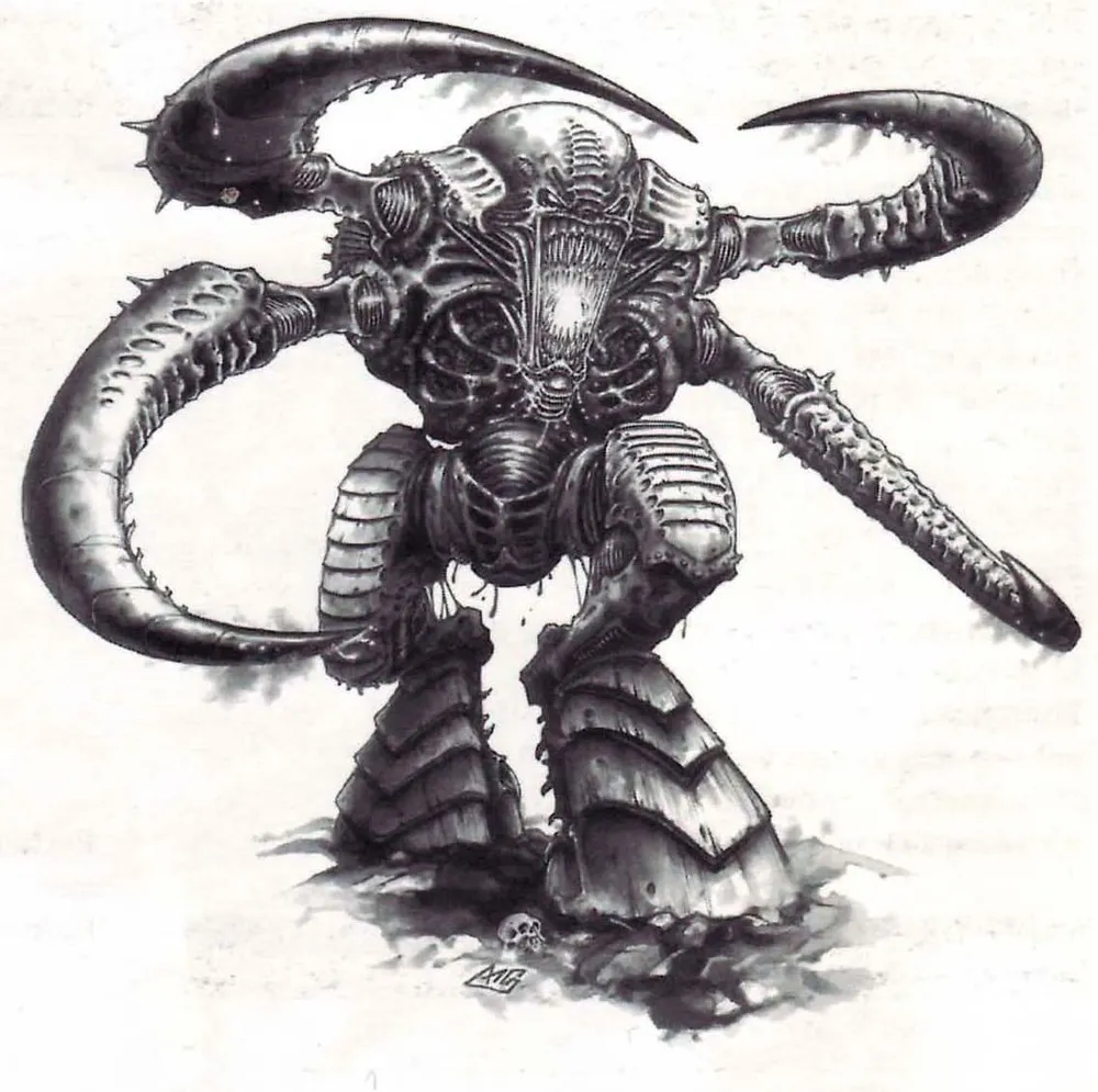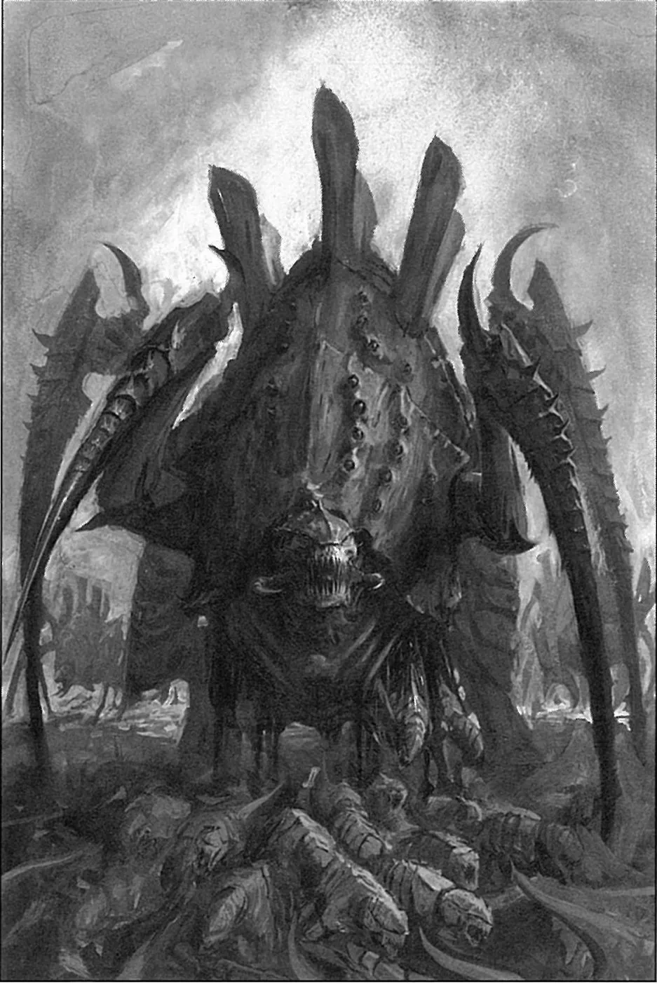 А вот это уже карнифекс («carnifex» — палач в Древнем Риме, казнивший чернь), тиранидский аналог танка. Огромная бронированная тушка, мозгов нет, когтей полный комплект. Имперские гвардейцы прозвали зверушку «Крикун-убийца» за визг, издаваемый оной при выхаркивании шарика био-плазмы, который она потом направляет когтями куда надо. Эффект такой же, как у плазмопушки имперцев. Только вот сама не взрывается, так что шанса, что у карнифекса оторвёт полморды при попытке сплюнуть, нет. А жаль (гвардейцам). Карнифексы, несмотря на их размеры, передатчиками воли разума улья не являются, поскольку их основной метод атаки — хорошенько разогнаться, во что-нибудь врезаться, кого-нибудь раздавив по пути, и начать кромсать всё когтями, сли живые цели закончились, повторить, если больно стреляют — пустить шарик плазмы — мозгом, большим чем «ультрамини» воспринимается как самоубийство. Что мешало бы.