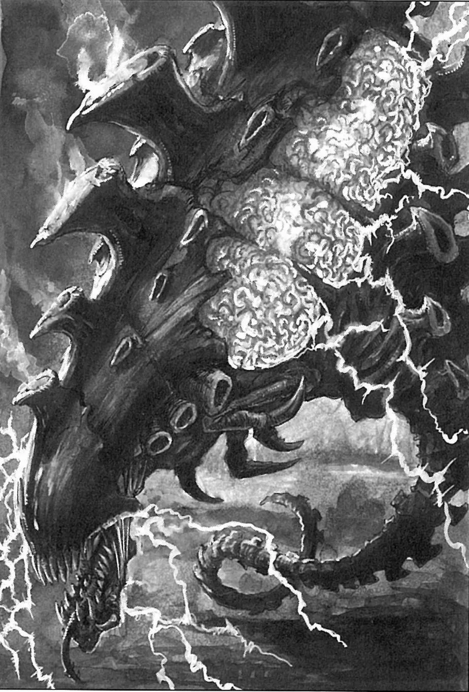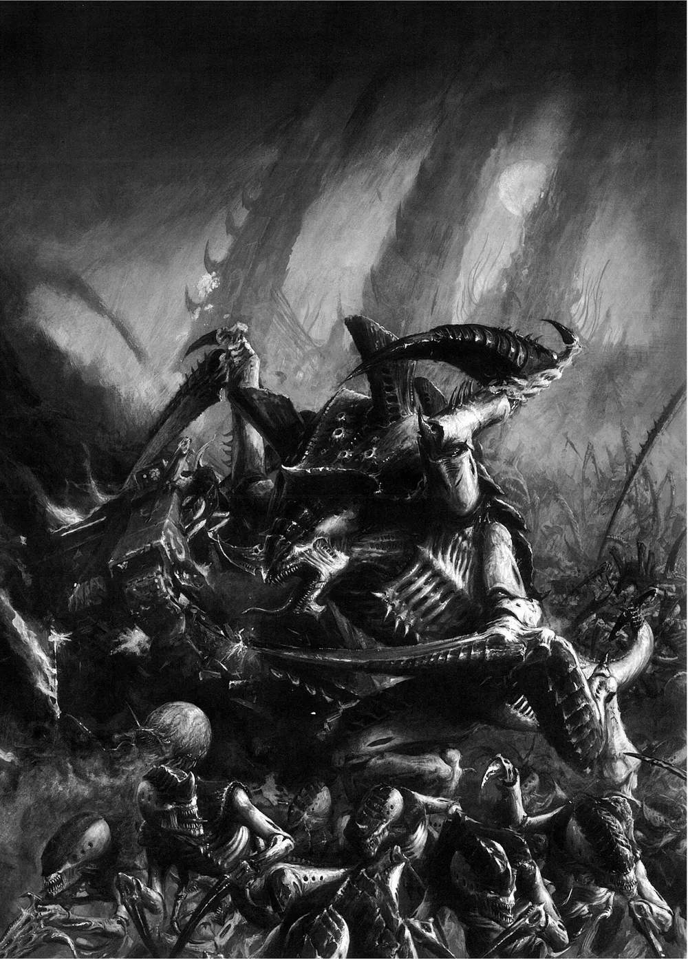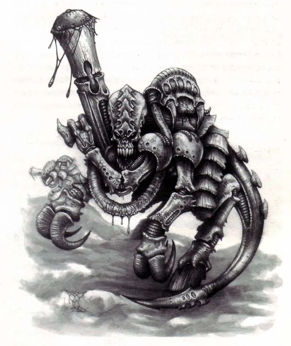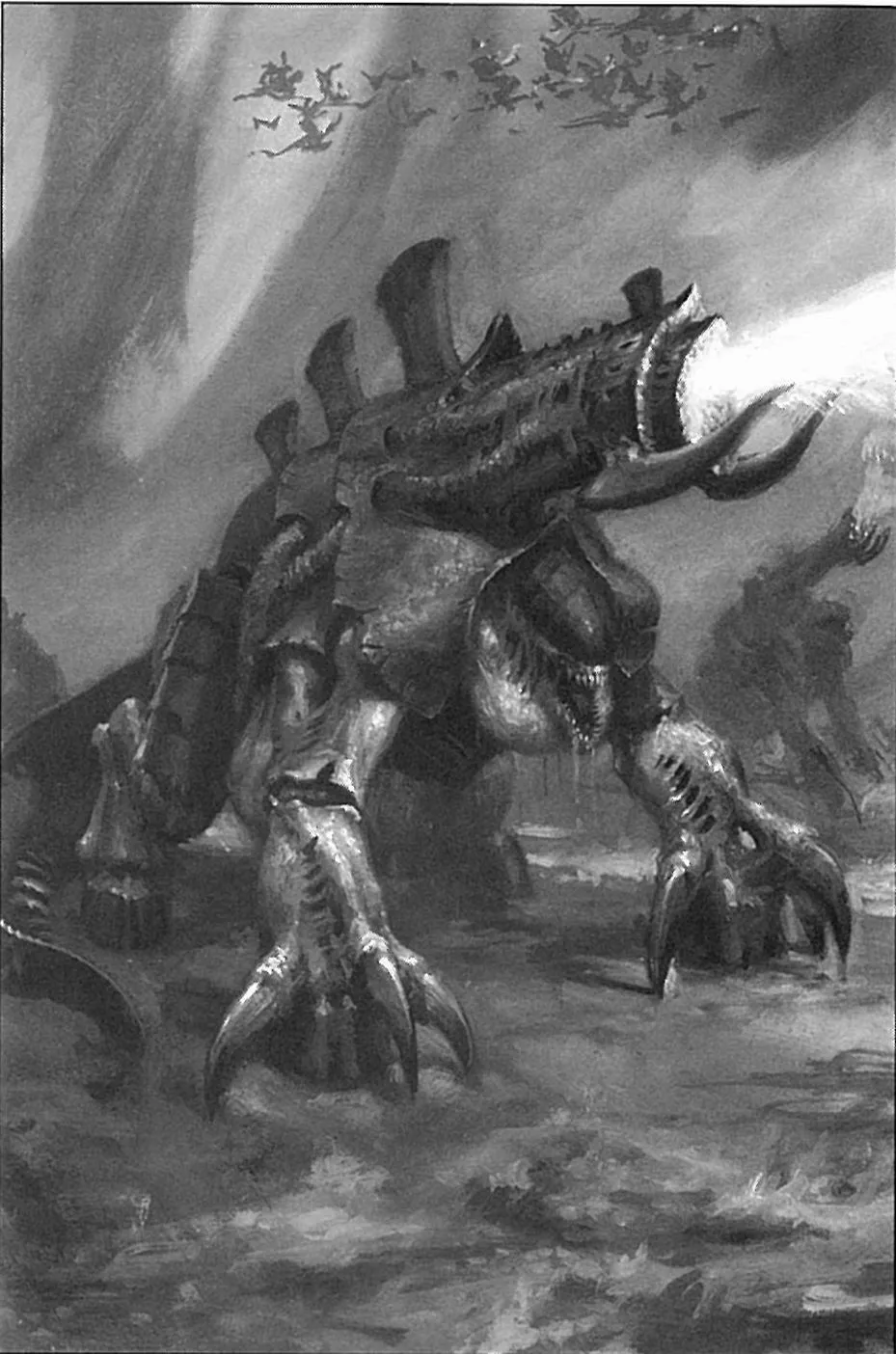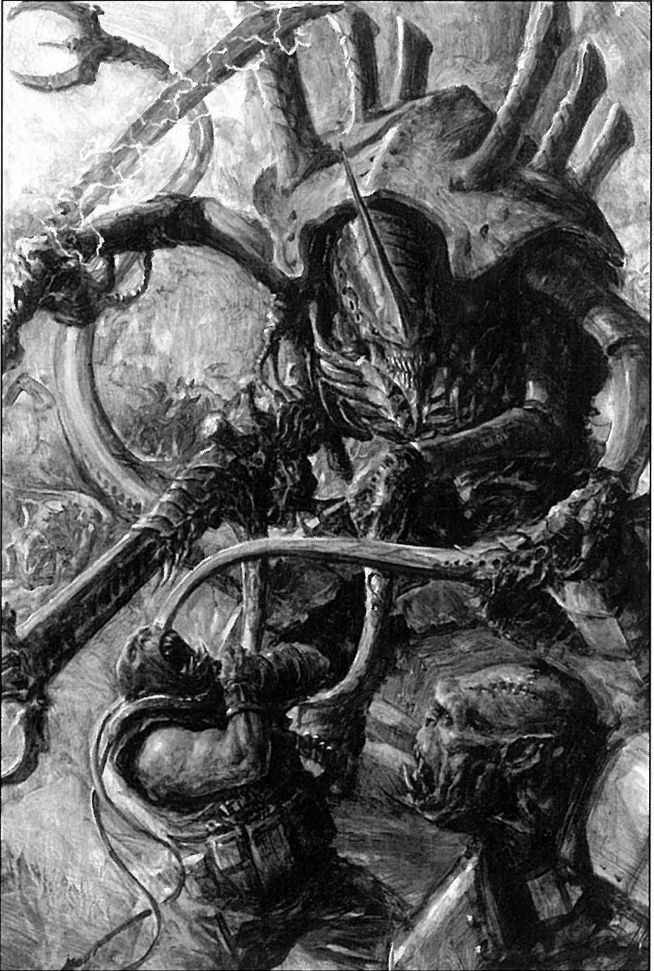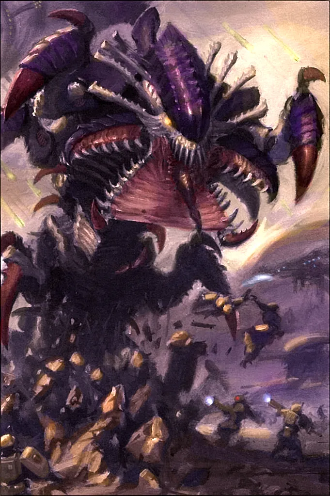 Ещё одна «землеройка», на этот раз огромная, выше карнифекса, тяжелобронированная и испускающая электричество при движении. Замечательное существо, способное вырваться на поверхность и убить пару-тройку танков… и ещё пару-тройку… и ещё вот этих смешных бегающих двуногих. Самое поганое в трайгоне даже не это, а тот простой факт, что по прорытым им туннелям очень любят бегать другие тираниды, так что вылазит-то он один, но скоро эта дырка станет огромной брешью в обороне.