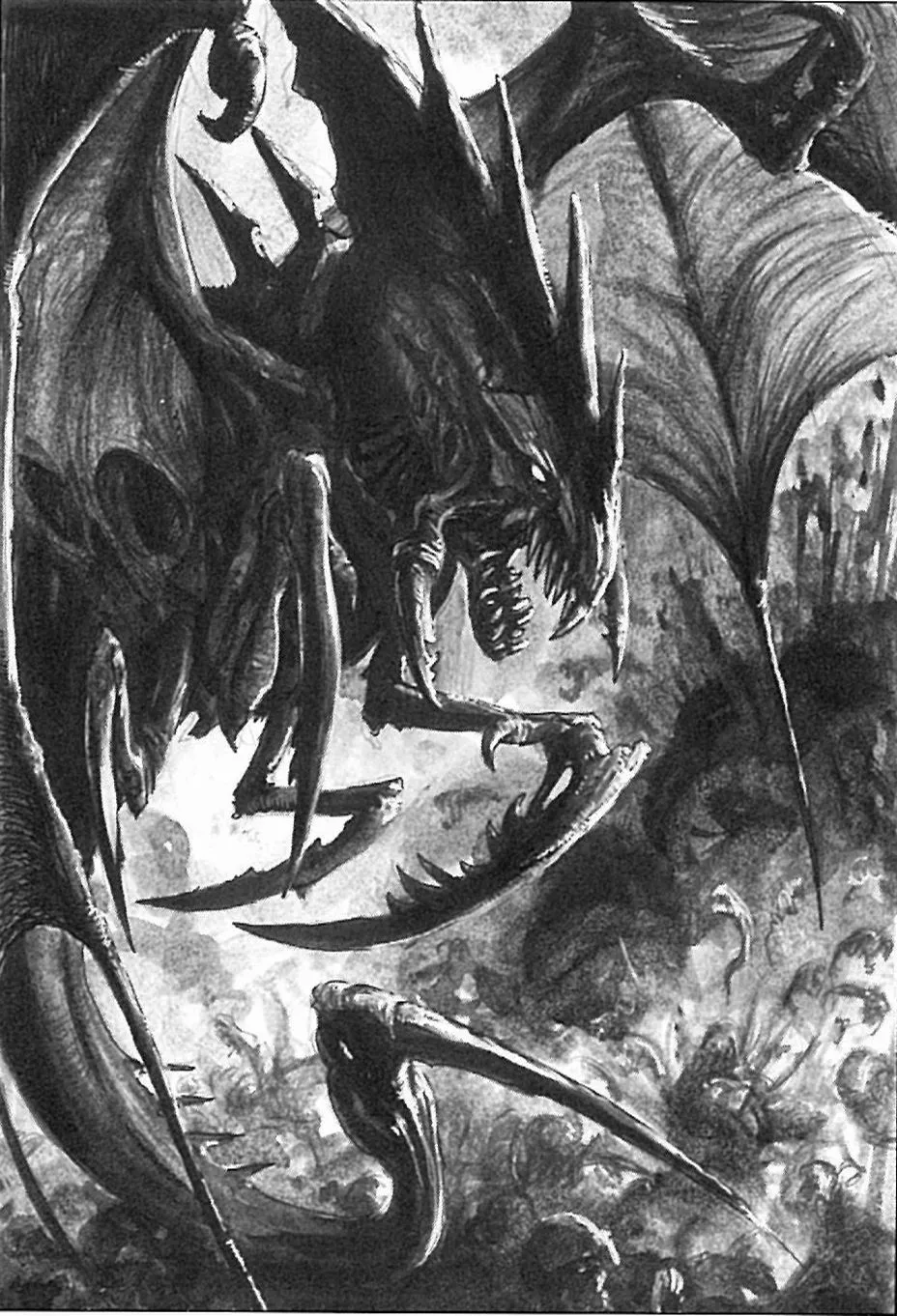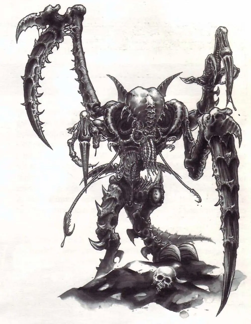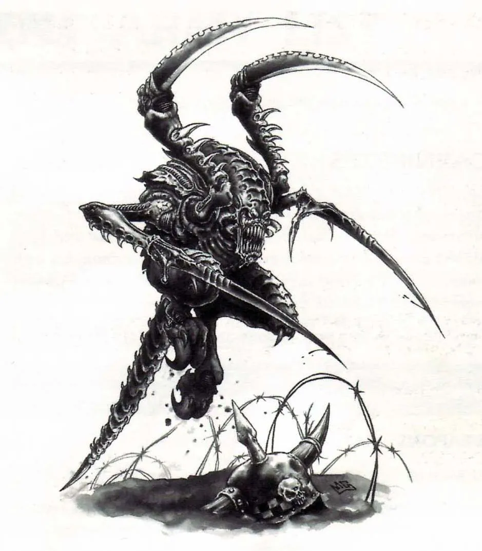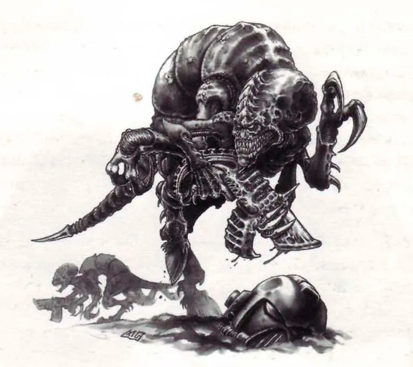 А вот так выглядел зоантроп в ранней редакции, когда он ещё был мутацией воина тиранидов и не умел летать. Хотя голова у него уже тогда была слишком большая, поэтому псионикой он её всё-таки поддерживал.