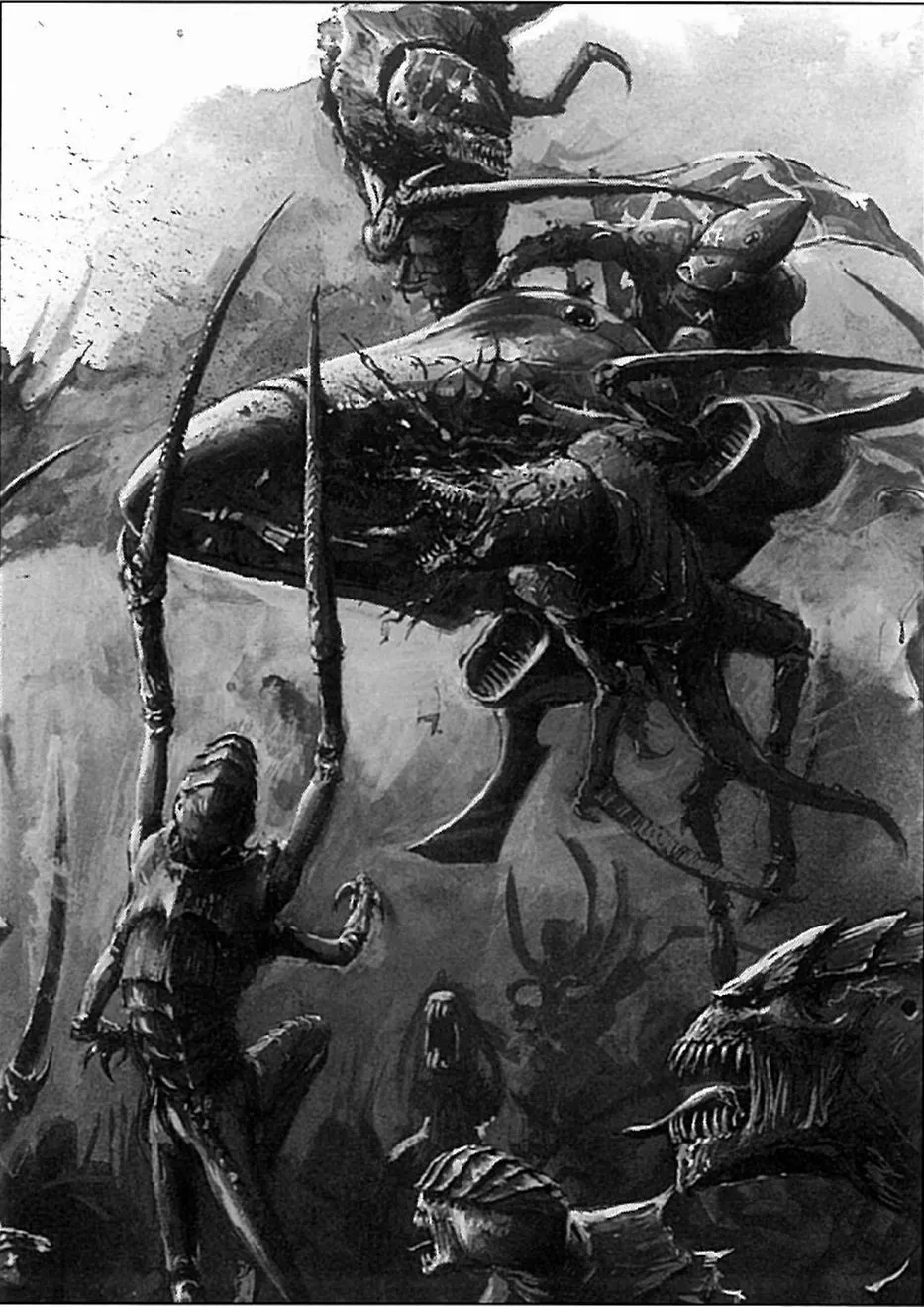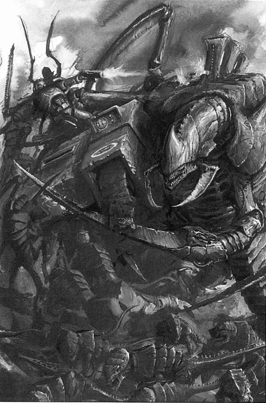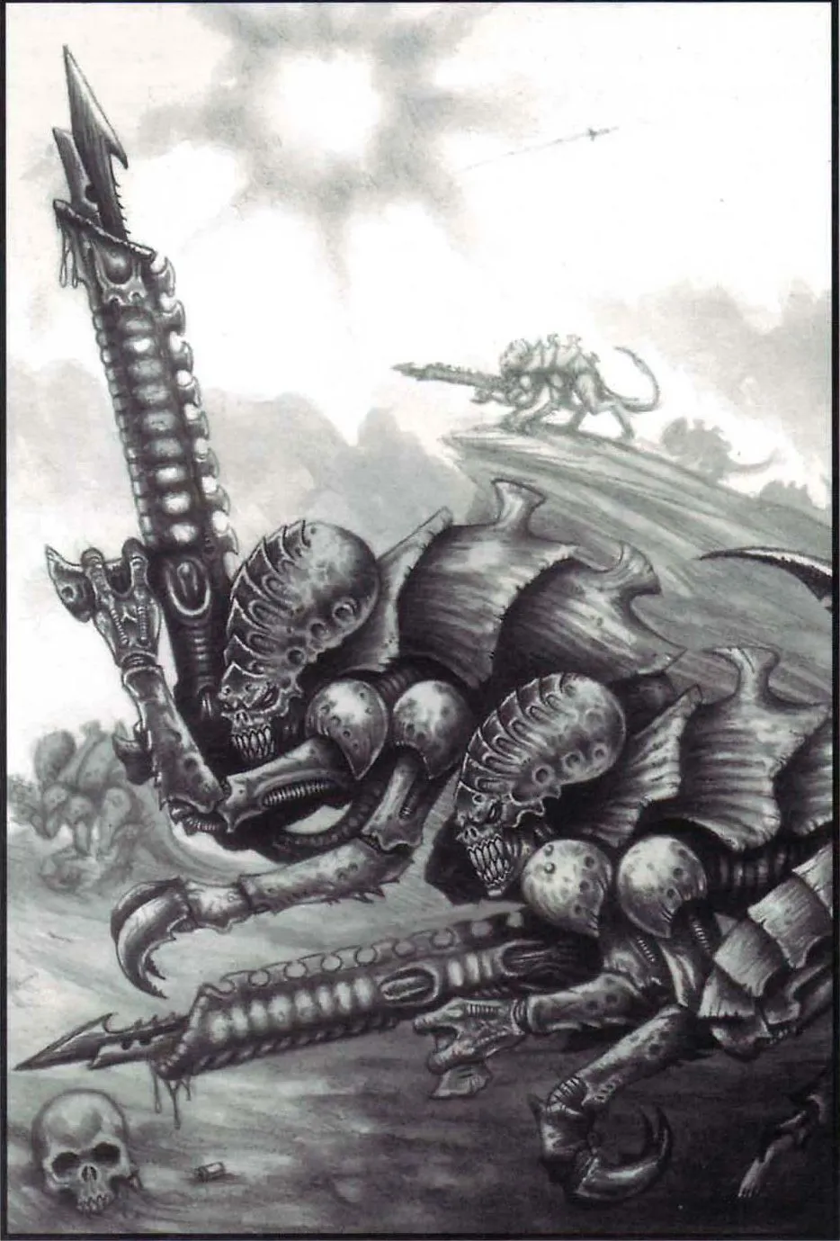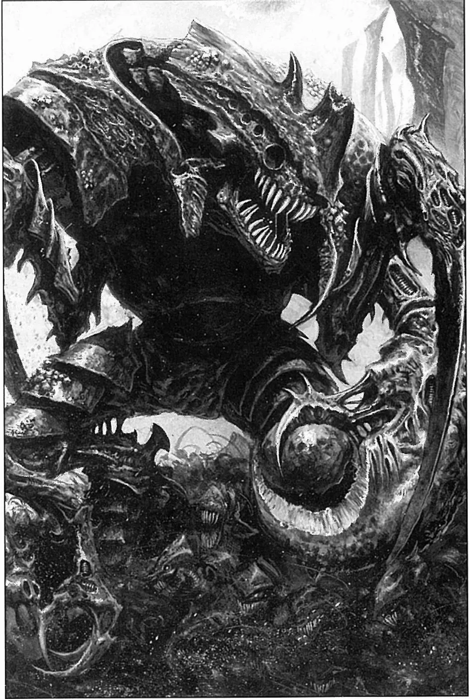 Как я уже говорил, без тирана войско тиранидов становится стадом. Как следствие, его потеря на участке фронта — очень большой косяк. Поэтому его защищают эти милые существа с минимумом мозгов и максимумом брони. Инстинкт самосохранения у охранников тирана отсутствует напрочь, чтобы не мешал им подставляться под удары. Бойцы из них не ахти, но вот телохранители —идеальные. Крайняя специализация вообще отличает все организмы тиранидов, что и не удивительно — их выращивают под конкретную цель. Организмы, своей цели достигнувшие и благополучно издохшие, просто пожираются потом вместе с остальной биомассой планеты. Таким образом, если защитники планеты перебили кучу тиранидов, но потеряли саму планету, в графе «Расходы» Великий Пожиратель может смело писать только «Время».