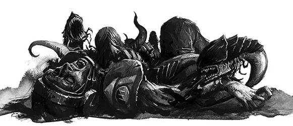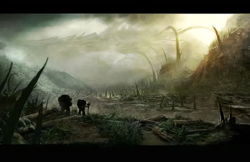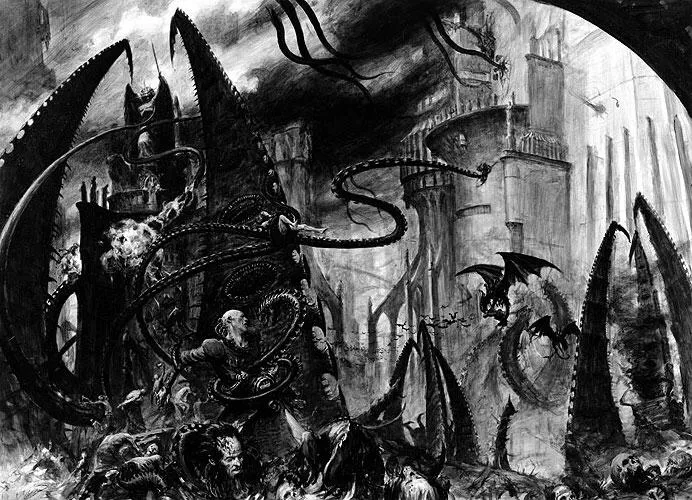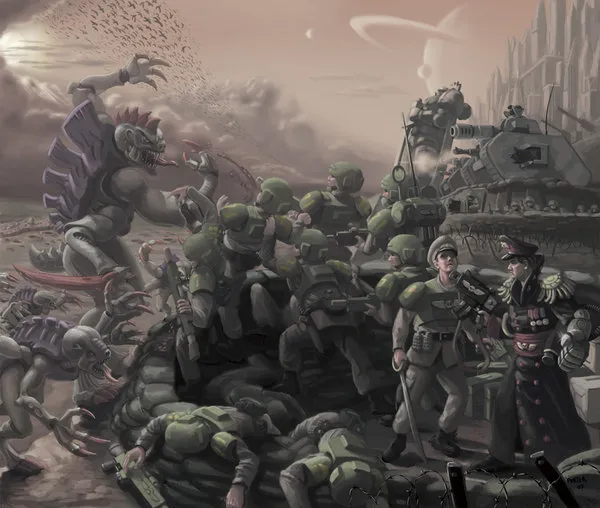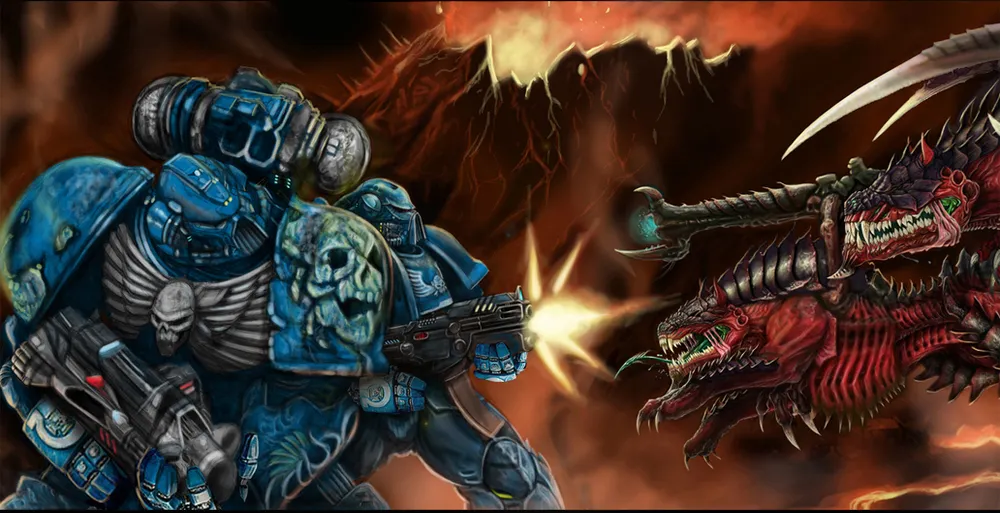 Забавный арт про то, как тираниды наткнулись на планету, осваиваемую армией князя демонов Хорна. Демоны огребли, несмотря на то, что на арте они превозмогают.
