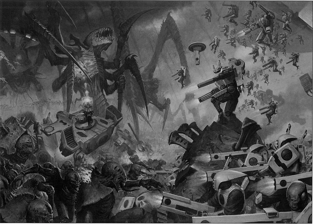 Кажется, что тиранидов — мириады. Это не так. Тиранидов — один экземпляр. Все особи тиранидов соединены в огромную психическую сеть, составляющую единый организм. Каждое существо, входящее в рой, служит ему клеткой безразмерного тела. Каждый разум — частичкой его личности. Это существо, как и всю «расу», имперцы назвали Великим Пожирателем, потому что существует весь рой лишь для того, чтобы поглощать биомассу. Когда тираниды нападают на планету, они стремятся не захватить её, а сожрать всё живое на ней, оставив позади лишь голый камень. Единственное, что пока смогли придумать имперцы, та единственная контрмера, применяя которую, инквизитор Криптман уничтожил целый пояс планет — вирусная бомбардировка поверхности. Жителям планеты, отметим, от этого не легче.