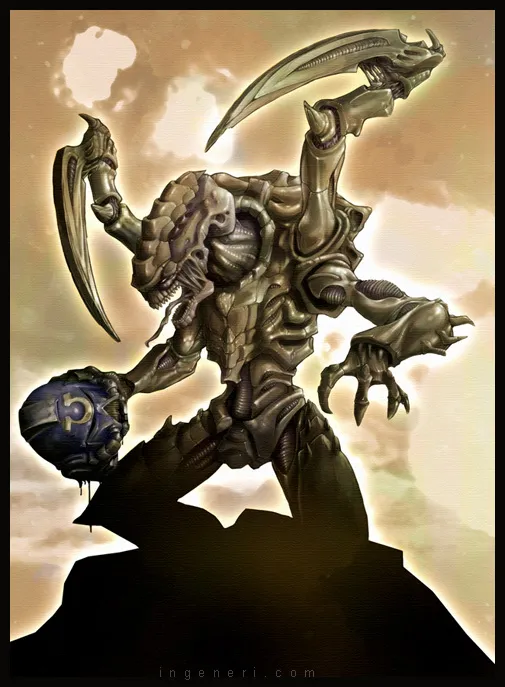 Тираннофекс. Зверушка, бронированная как крепость. Конечно, не титан, но вполне сгодится, учитывая то, что плодить их легче, чем титаны строить. Умеет запускать два снаряда подряд: в первом жидкость, в которой противник основательно вымазывается, во втором — реагент. При смешении содержимого обоих шариков происходит взрыв, уносящий в небытие что пехоту, что технику.