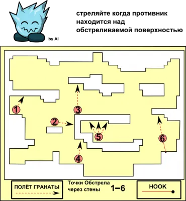 Карта - dm1, 8 точек, стрелками показана траектория полёта гранаты, точками - хук.