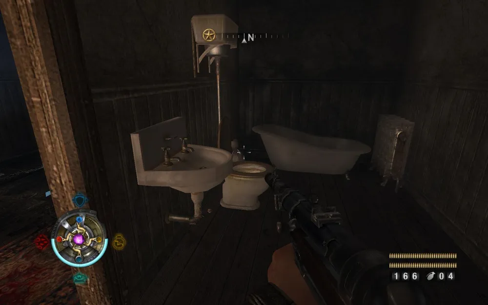 Идем дальше. В ванной, перед тем. Как спрыгнуть вниз, находим золото.