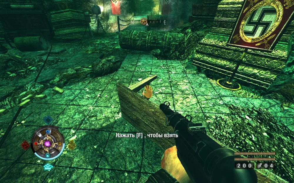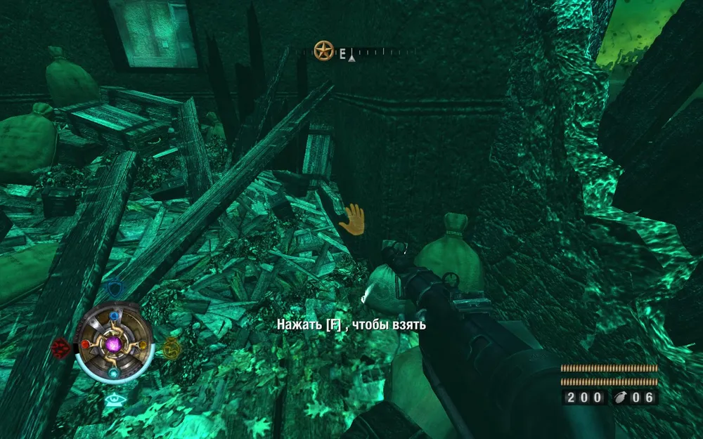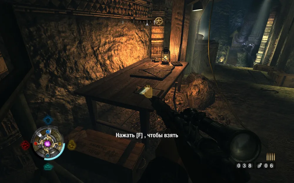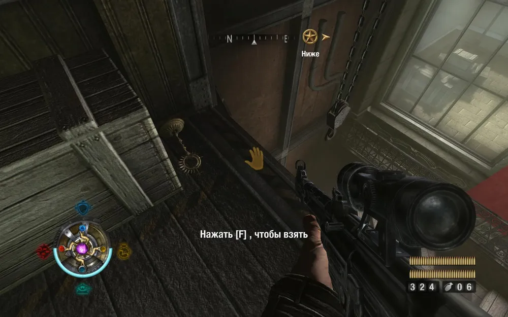 Идем направо, уничтожаем пулеметный расчет, осторожно идем по балкам. За ящиками лежит золото.