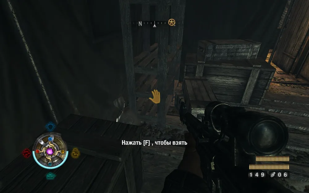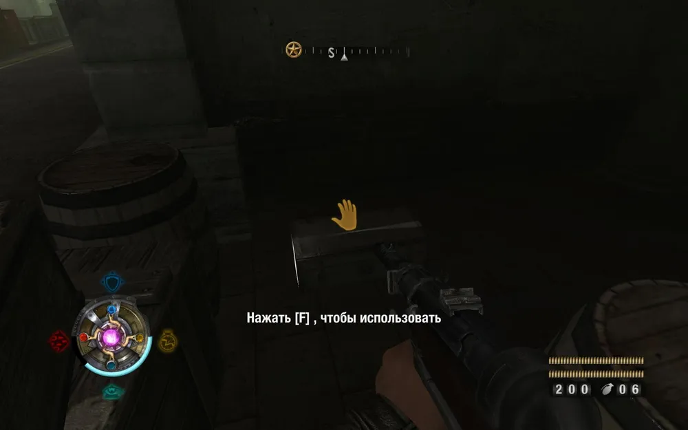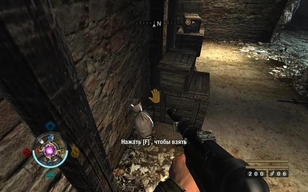 Проходим дальше, находим гору больших ящиков. Приседаем и продвигаемся между ними. Находим золото (слева).