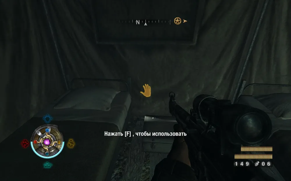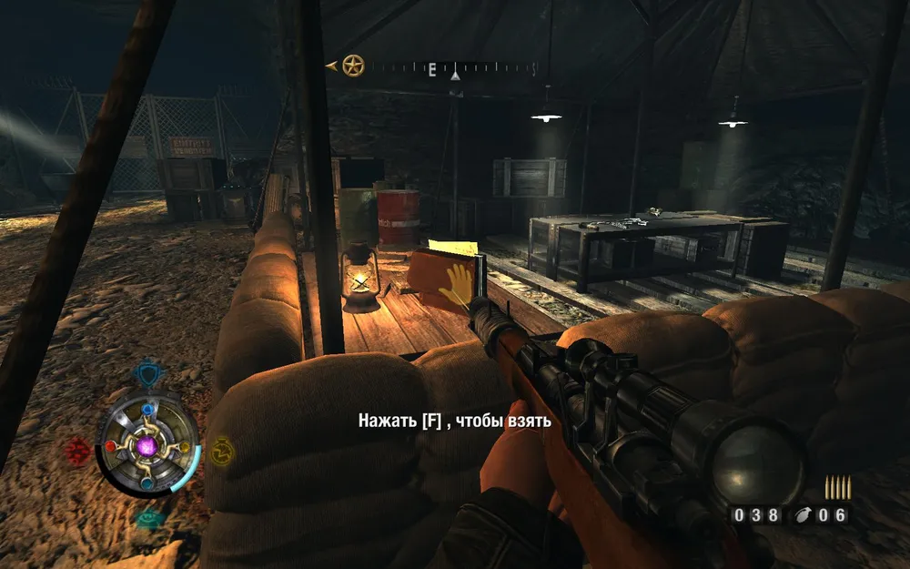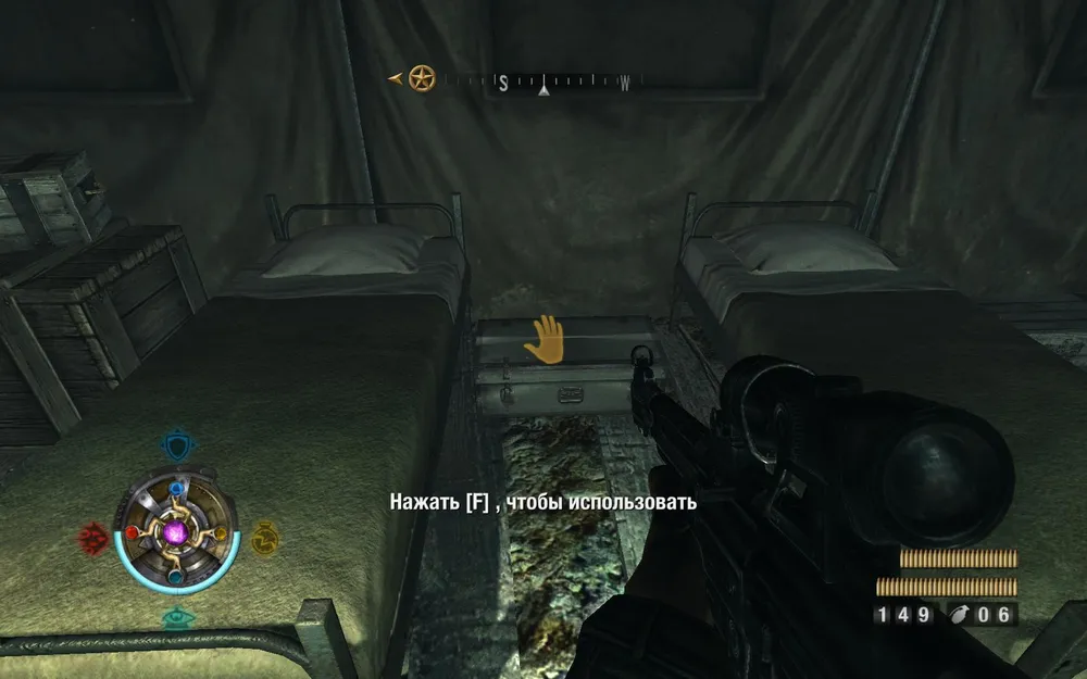 Выбегаем из этой палатки, бежим налево в дальнюю. Находим у кроватей аж два ящика с золотом.