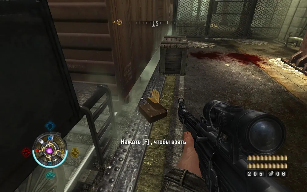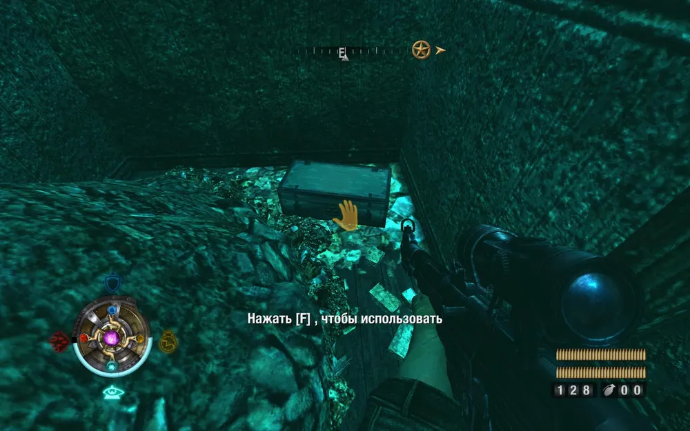 Разворачиваемся на 180 градусов, уничтожаем ящики, пролезаем под решетку, за ней (справа) сверкает ящик со слитком.