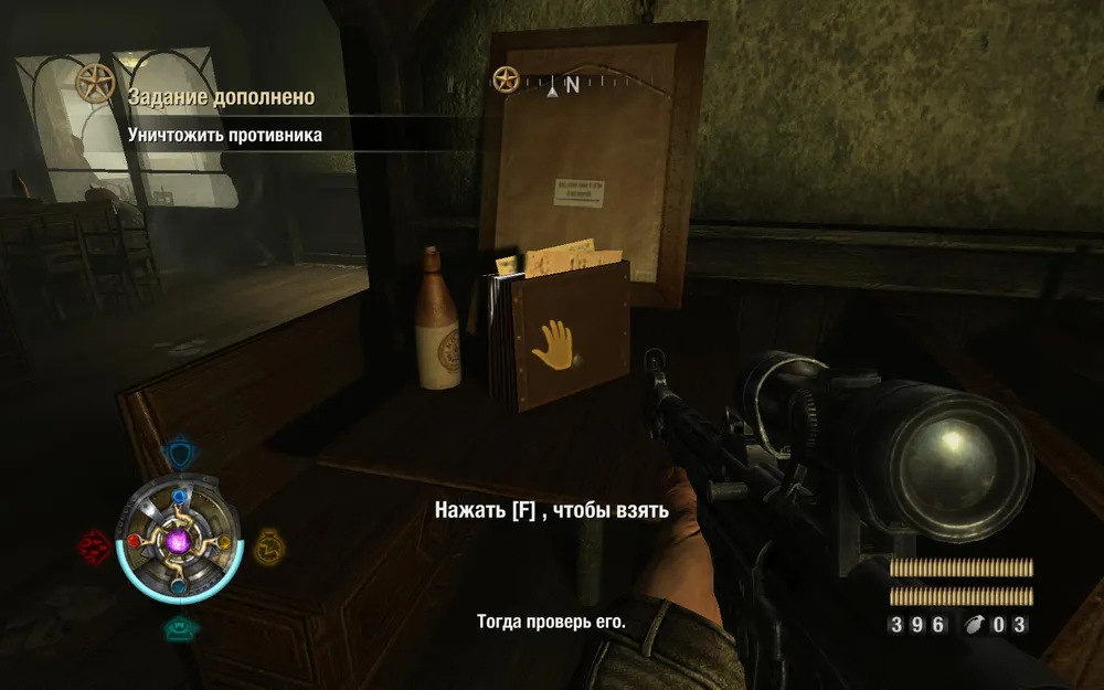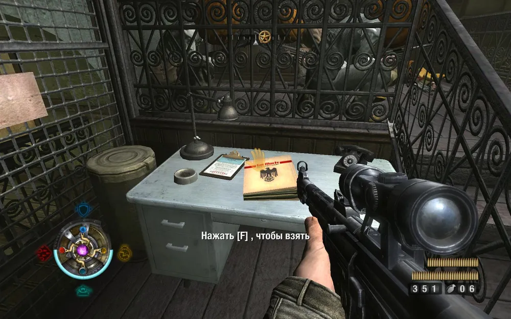 Справа от входа убиваем двух фрицев и берем золото и документы.