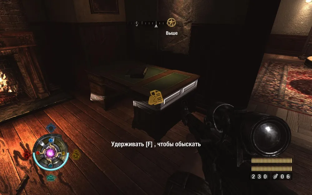 Поднимаемся по лестнице и идем в противоположную цели сторону. Находим документы и золото.
