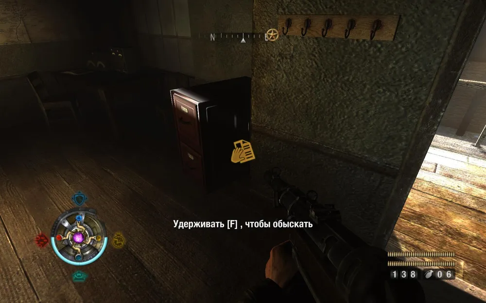 Спускаемся на этаж ниже и за наклоненным шкафом находим золото.