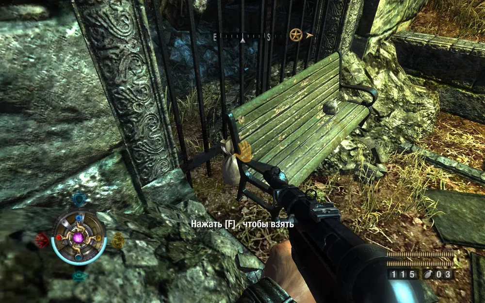 Переходим по мосту на другую сторону. Не торопимся идти вниз, исследуем закутки слева. Находим данные и золото.