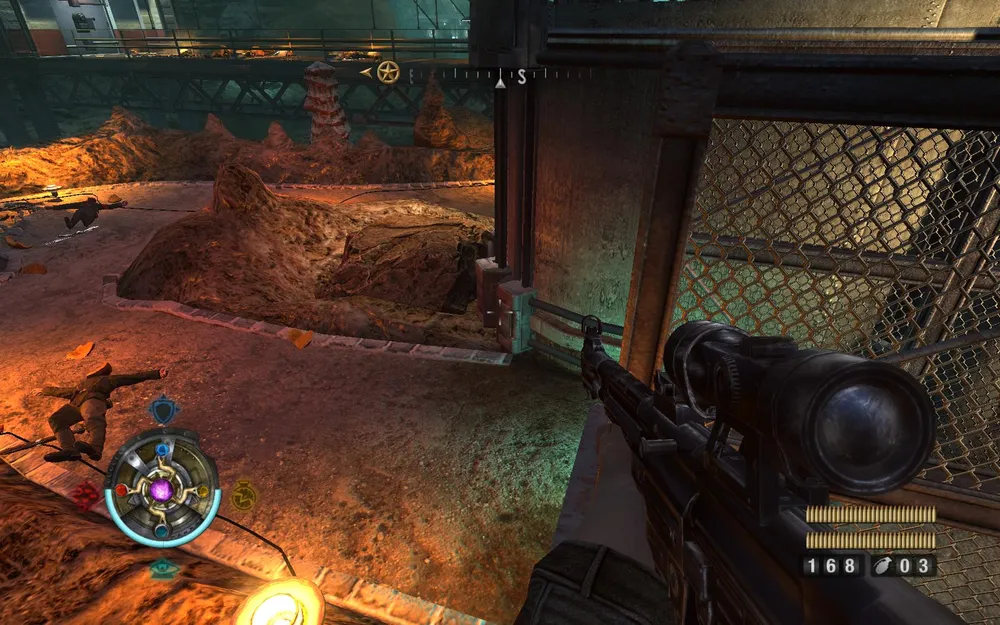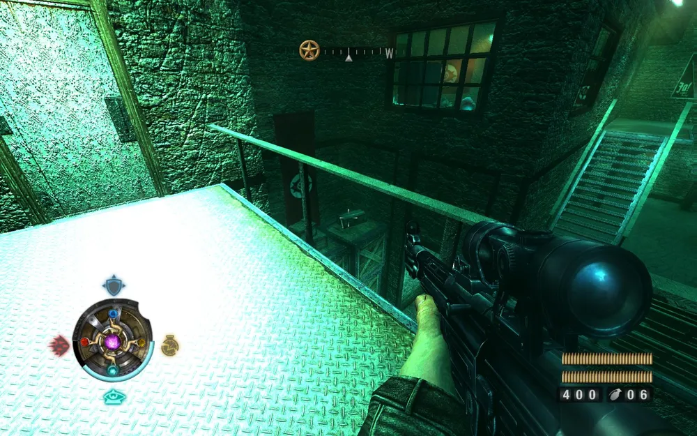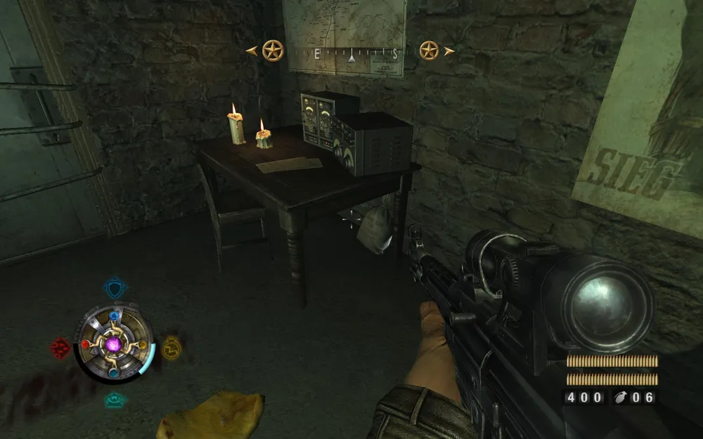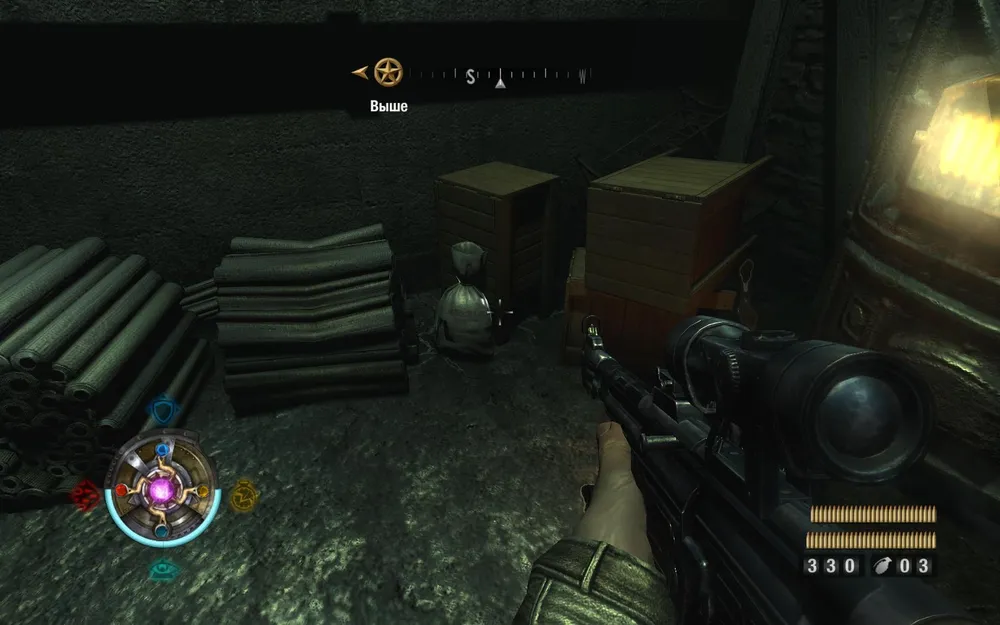 Идем дальше. Когда доходим до пулеметчика, идем в стену слева и навещаем беднягу. Золото.