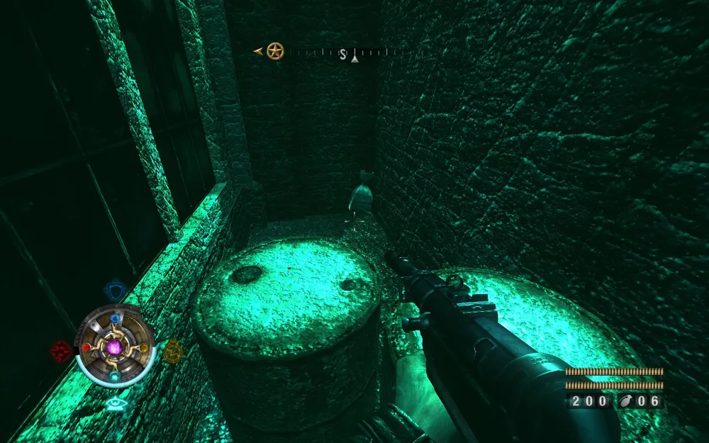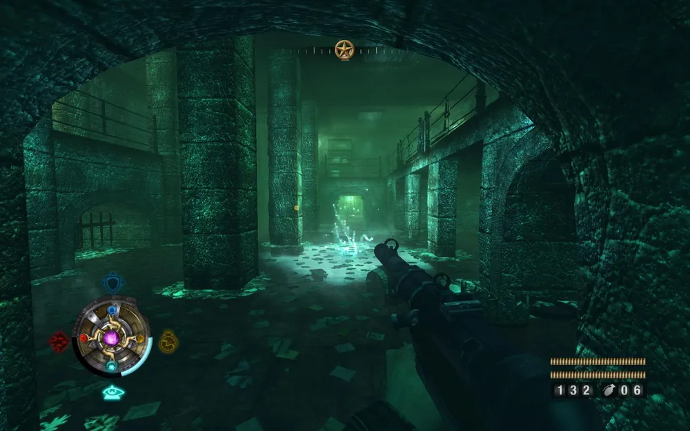 После убийства босса берем кристалл. Убиваем появившихся фрицев и идем туда, откуда они пришли, т.е. за двери и вниз. Фолиант.