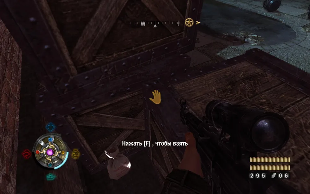 Разбираемся с подкрепление на грузовике и идем налево. Заходим через стену в амбар. На втором этаже золото, два мешка.