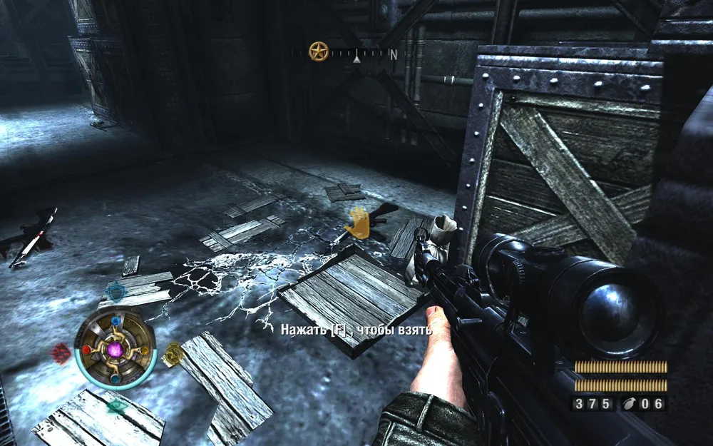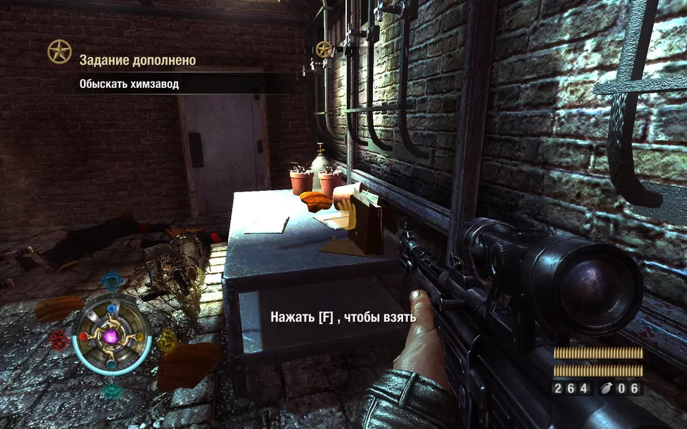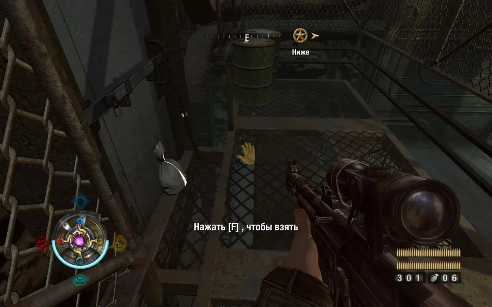 Вышли в какой-то цех, спрыгнули вниз, поползли направо, наткнулись на золото.