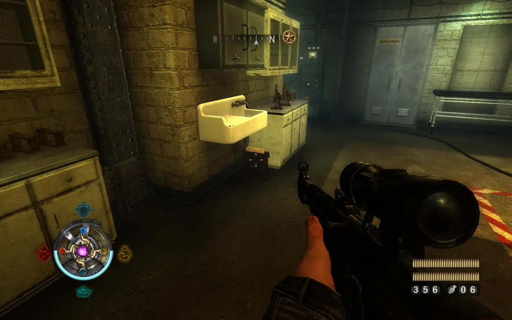 Проходим силовой щит, идем налево, проходим через стену. У лифта находим золото.