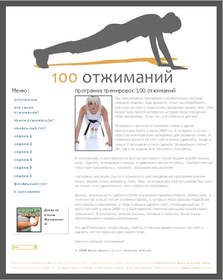 Он сделал из простых и банальных отжиманий, целую методику, название которой «100 отжиманий». Курс рассчитан на шесть недель, у каждого свой уровень и ограничение по возрастам. Оформление у сайта вполне приятное, уютное.