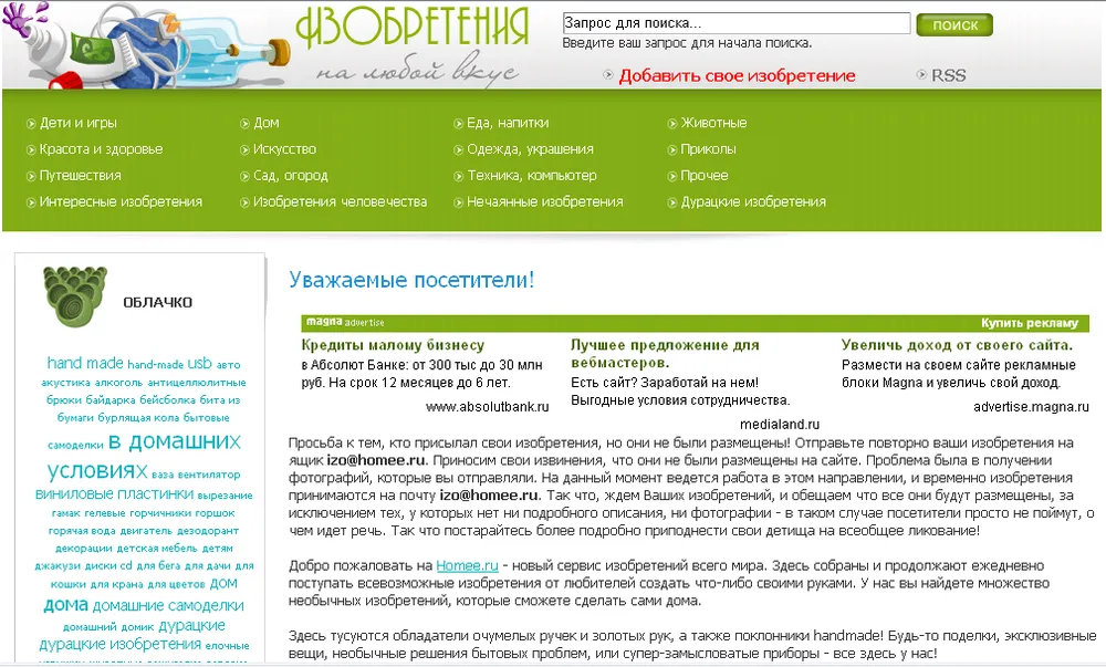 Вот ещё один вполне полезный и увлекательный сайт, который мне очень понравился. Называется он: Изобретения на любой вкус. Фишка сайта в том, что он включает в себя всевозможные изобретения, с подробным описанием, которое, кстати, пишете вы. Библиотека постоянно пополняется и продолжает радовать нас интересными изобретениями, такими как: Гравитационная Элэктро станция, или Прибор, способный улавливать пары алкоголя и многое другое. Ну и, конечно же, ссылка www.homee.ru .