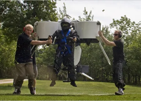 5. Персональный реактивный ранец. Наверно, многие видели безумцев, летающих на реактивных ранцах, хотя бы на экране телевизора. Но в этом году компания Martin Jetpack, возглавляемая изобретателем Гленом Мартином, продемонстрировала на авиасалоне в Ошкоше прототип самого настоящего серийного реактивного ранца. Работает он за счёт двух турбин и, в отличие от своих ракетных собратьев, позволяет зависать на месте, в нескольких метрах над землёй. Стоить он будет около 100000 долларов, что для такой штуковины, поверьте, вовсе не так уж и много. Максимальная скорость, которую позволяет развить эта... вещь, составляет 97 км/ч.