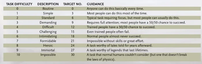 - Сложность задачи определяется игровым мастером. Диапазон 0-10. 0 означает автоматический успех действия. Остальные сложности умножаются на 3, а игрок бросает кубик d20, пытаясь перекрыть это число. Таким образом, любая задача со сложностью выше 7 становится невыполнимой без дополнительных средств.