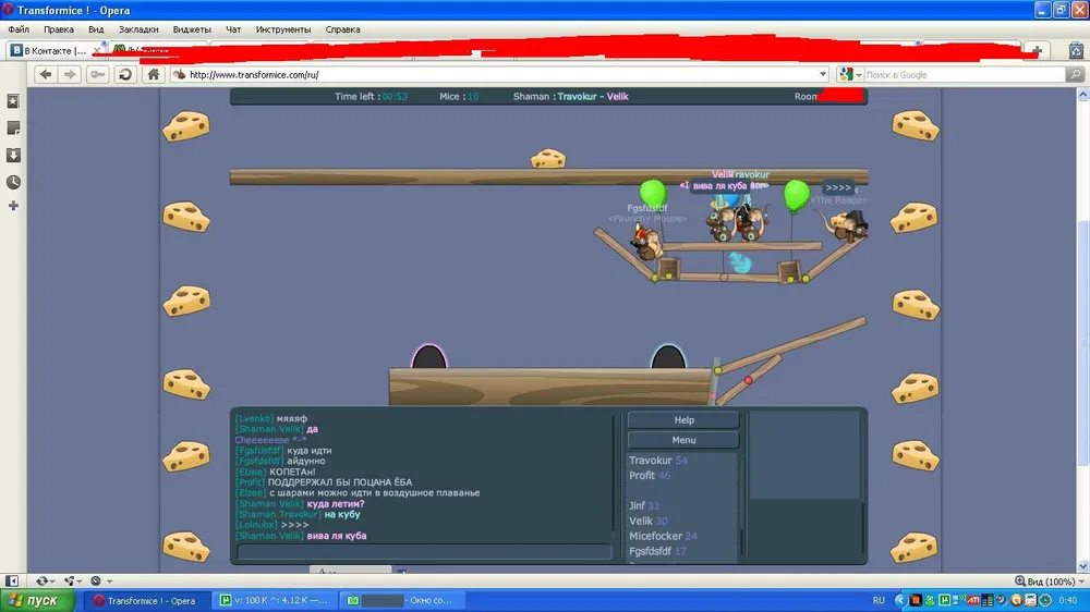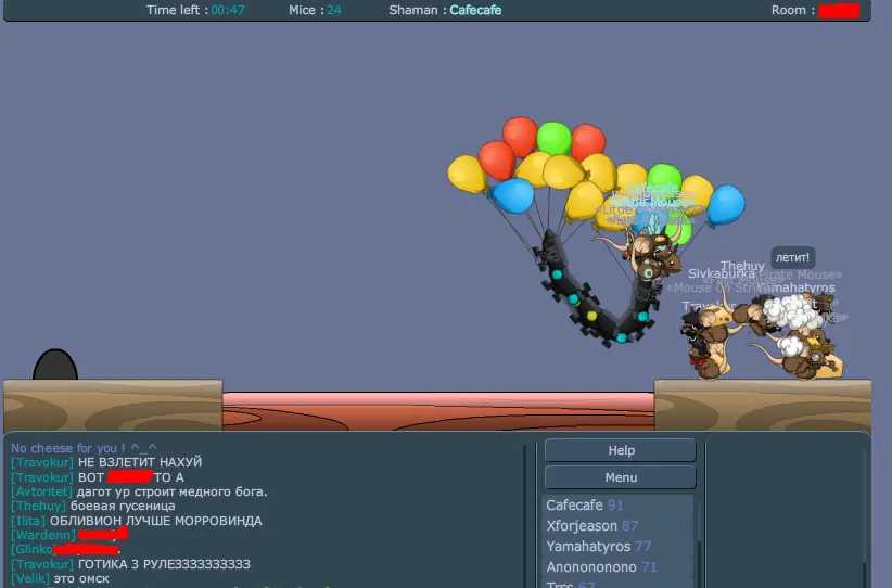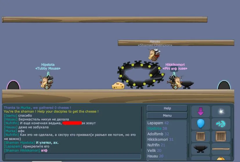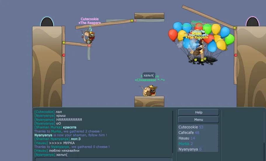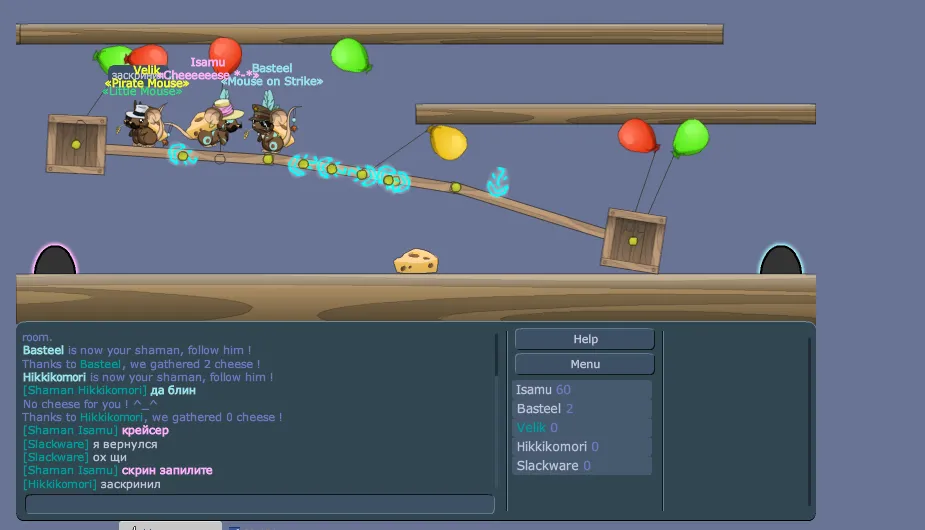 Вы пояляетесь на одной из 95 карт, главная задача взять сыр и отнести его в норку, но не все так просто, одному большинство карт пройти сложно (а некоторые невозможно), поэтому вам помогает шаман.Шаман может создавать доски,воздушные шары, ядра и ящики, благо у игры есть неплохая физика все это можно скреплять, поварачивать, прибивать и так создавать разные конструкции(от самолёта до машины).Шаманом становится одна из мышей у которой больше всего очков(см. ниже)+полезно знать пару горячих клавишь.Колесо или ctrl-повернуть предмет,пробел-создать предмет который будет взаимодействовать только с другими предметами,В-создать доску который будет постоянно крутится вокруг своей оси,С-прикрепить предмет к другому предмету,V-создать предмет который будет крутиться вокруг своей оси если с ним взаимодействовать,N-создать предмет который будет бытро крутиться вокруг своей оси сам.Когда вы успешно добегаете до норки с сыром к вам в копилку зачисляется один сыродолар, за них можно покупать всякие украшения для свей мыши, начиная от шлема викинга и соломеной шляпы, заканчивая усами, и моноклем.Кроме сыродоларов за сыр даются очки, если вы пришли к норе первым то вам дается 16 очков, вторым 14, третьим 12, 4,5,6,7,до бесконечности 10 очоков.За смерть штраф за смерть 1 очко, также если вы играете шаманом количество мышей которым помогли пропорционально количеству очков.В игре есть статусы показывающие какой у вас уровень умения(сего 119 статусов).Также есть разные поверхности, но о них я напишу завтра.