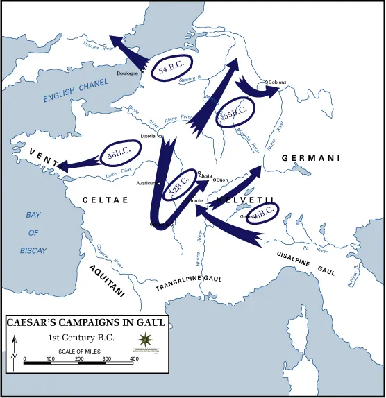 Галлия находилась на племенной ступени развития. В чем-то она далеко отставала, а в некоторых отношениях была столь же цивилизованной, как и Рим. Галлы в боевых действиях не отличались дисциплинированностью и полагались в бою главным образом на конницу. На этой территории появились из-за Рейна германские племена во главе с Ариовистом. В 59 до н.э., когда Ариовист обосновался в Галлии и отказался вернуть захваченные земли, эдуйские племена обратились за помощью к римлянам.